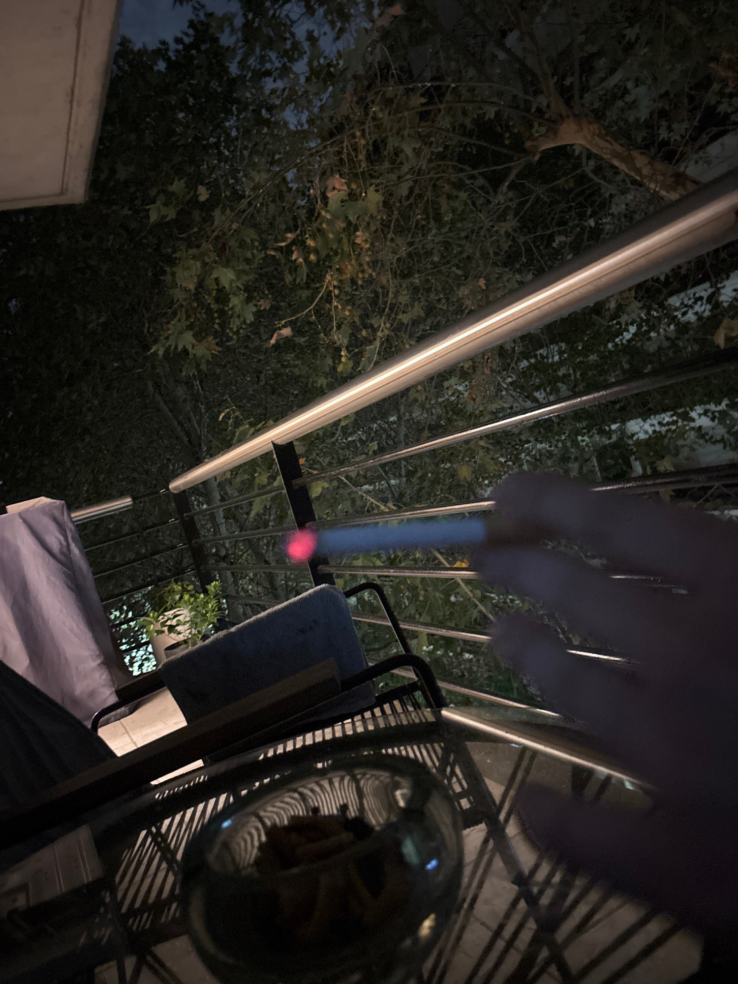 A nighttime, low-angle shot shows a partially obscured hand holding a lit cigarette. The background contains trees and a metal structure, possibly a pergola. Visible items include a metal chair and a…read more