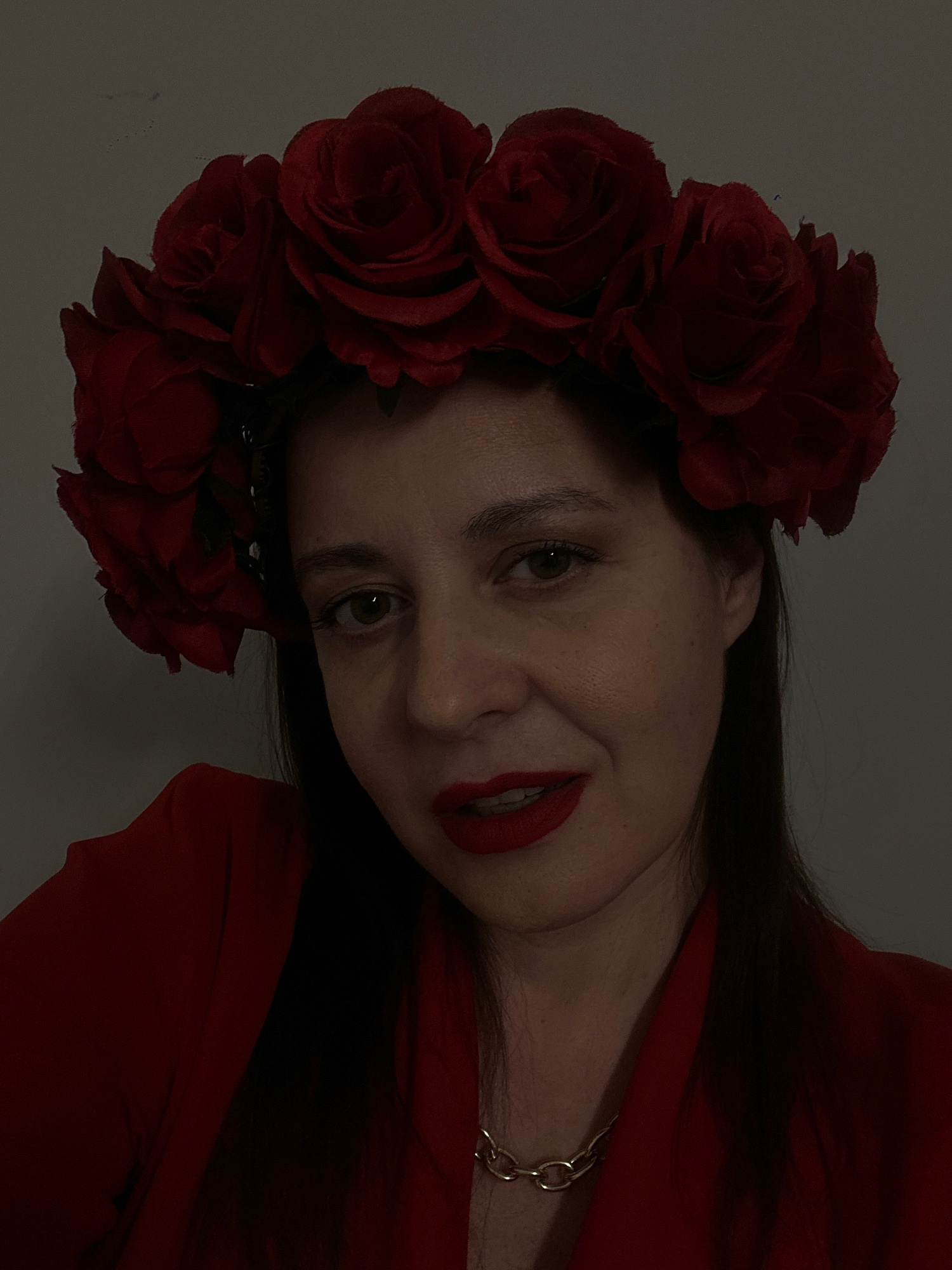 A woman is shown wearing a red rose headpiece. She also has red lipstick on, and a gold necklace around her neck. She is wearing a red blazer or shirt. The image appears to be taken in a dimly lit indβ¦read more