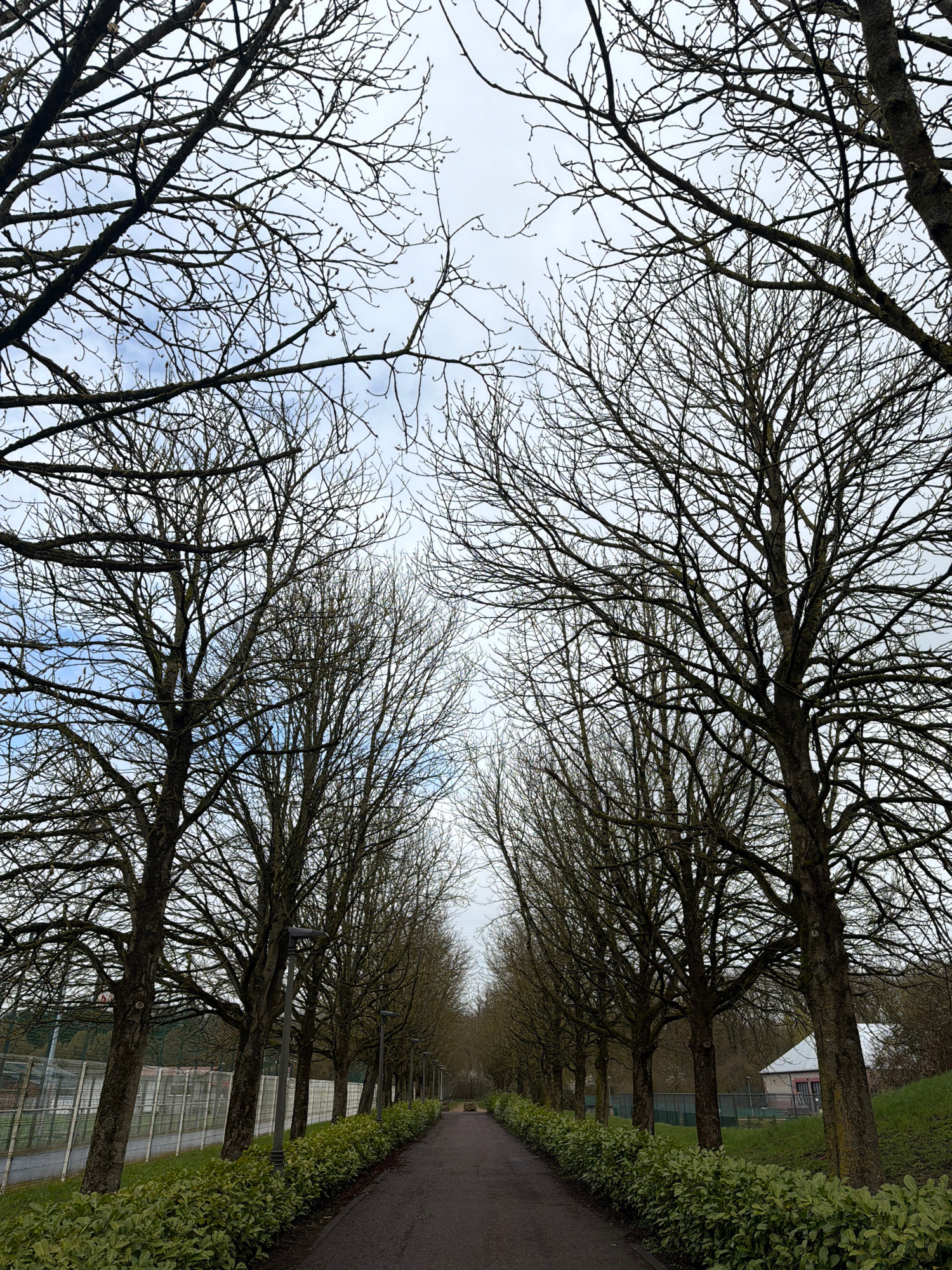 A straight-on perspective along a paved, dark-colored avenue extends into the distance, flanked on both sides by symmetrical rows of mature, deciduous trees with bare branches, indicating late winterβ¦read more