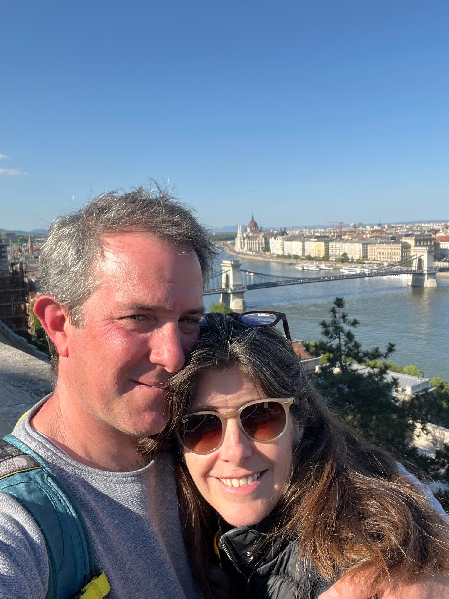 An outdoor, sunlit selfie captures a happy couple, a man and a woman, posing closely with a panoramic city view in the background. The man, with short greying hair, is seen in the foreground, smilingβ¦read more