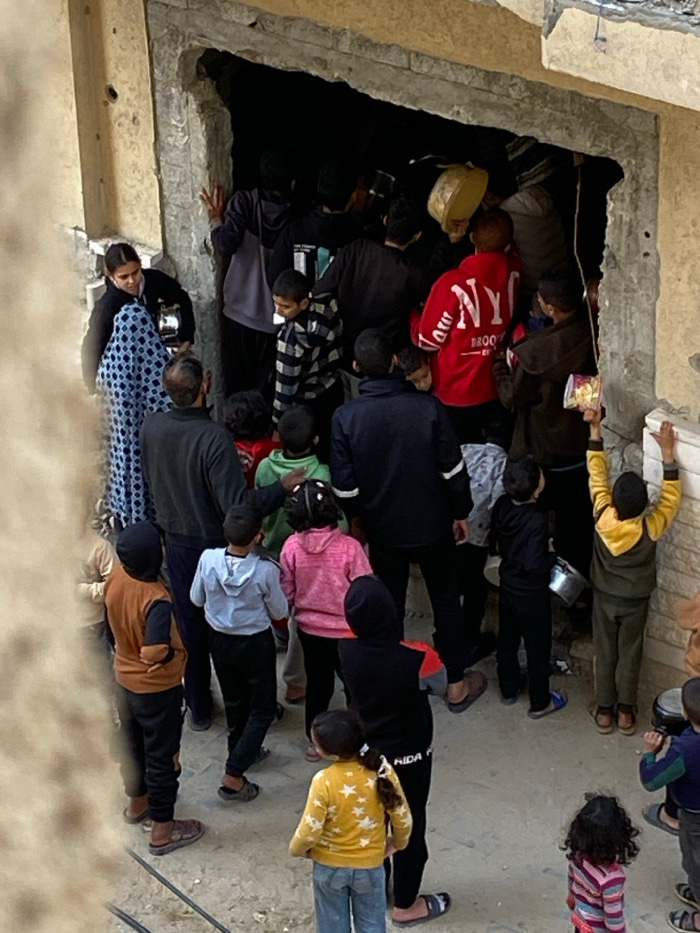 A crowd of approximately 25 individuals, predominantly children and several adults, congregates in an unpaved outdoor area adjacent to a dark, irregularly shaped doorway within a light-colored buildinβ¦read more