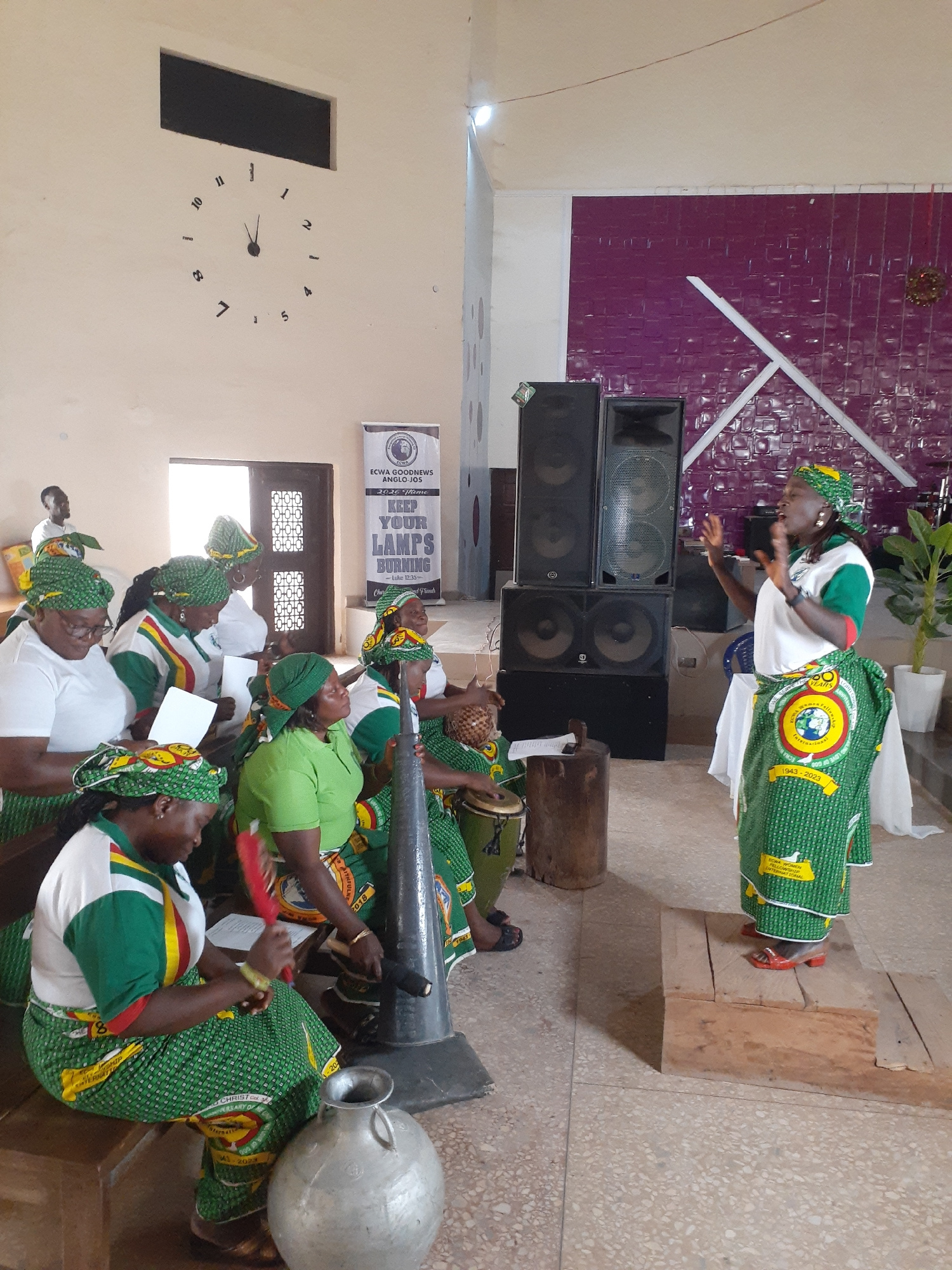 A brightly lit room in Barakin Lerawi, Nigeria, shows a gathering of people, predominantly women, dressed in green and white patterned traditional attire. One woman stands on a wooden platform near tw…read more