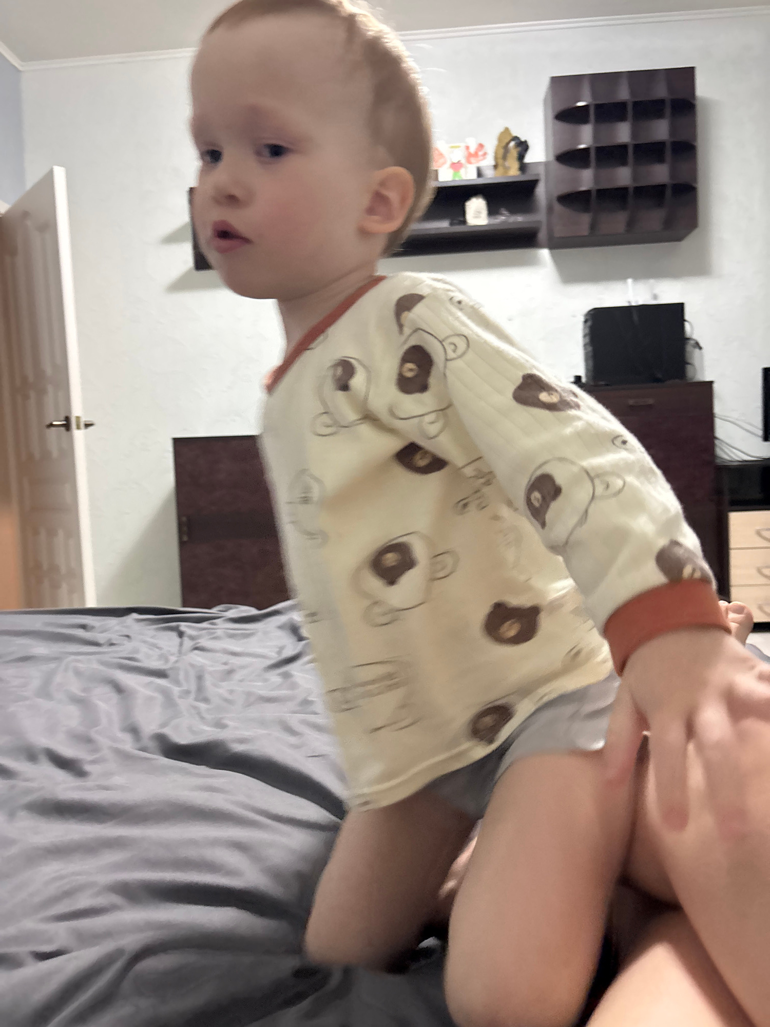 A child in a white pajama top with brown bear motifs is held aloft by an adult, likely on a bed covered with gray bedding. The room has white walls and a wooden door. Visible in the background are bro…read more