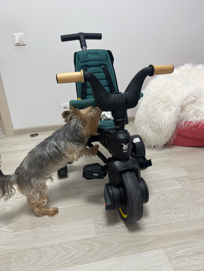 A tan and grey long-haired dog stands near a green and black tricycle with wooden handles, positioned on a light-colored wooden floor. A white fluffy pillow with a hint of red sits nearby. The tricycl…read more