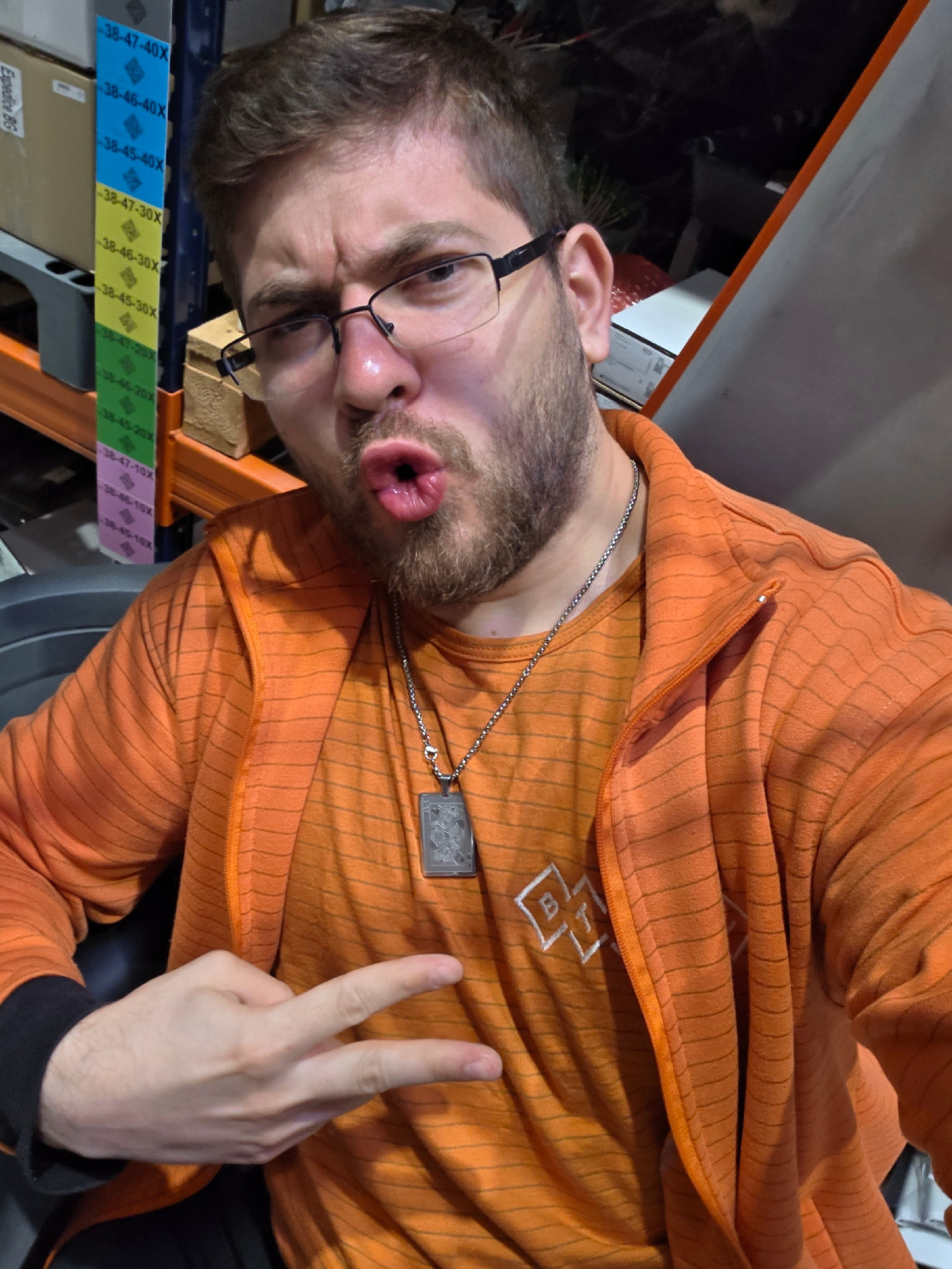 A man is pictured indoors, close to a shelving unit with size labels attached. The man wears an orange zip-up hoodie and a necklace with a square pendant. He is making a duck-face expression and holdi…read more