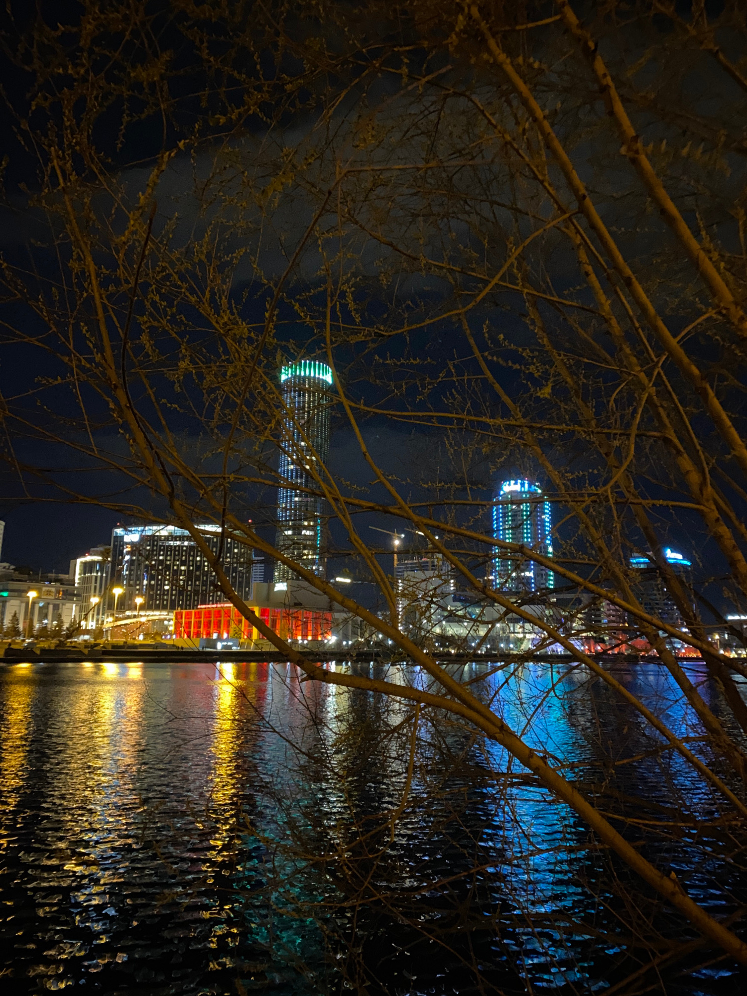 The image shows a nighttime view of the Iset River in Yekaterinburg, Russia, with reflections of illuminated buildings in the water. Bare tree branches frame the scene. Prominent buildings visible inc…read more