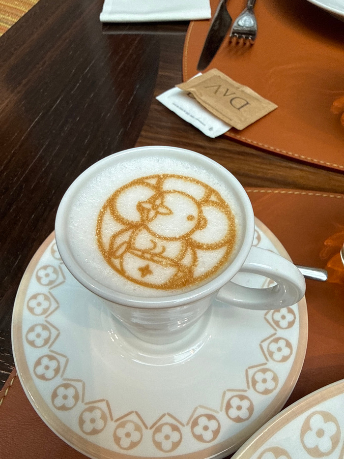A close-up image depicts a white ceramic coffee cup and saucer, positioned on a brown leather placemat atop a dark wooden table. The cup holds a beverage topped with white foam, featuring intricate la…read more