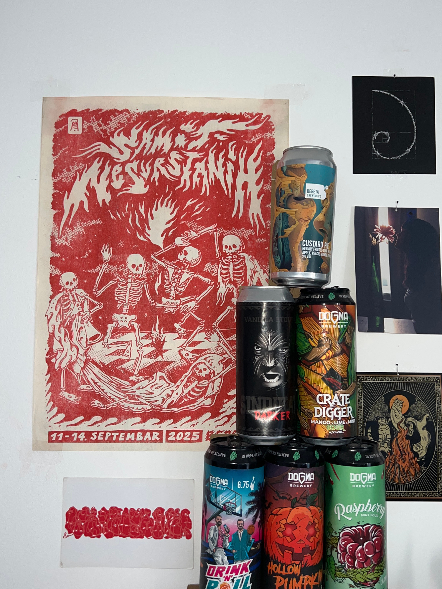 The image presents a collection of items affixed to a white wall. At the top left, there is a black square depicting a spiral. To its right is a photograph of a person holding a flower. Further right…read more