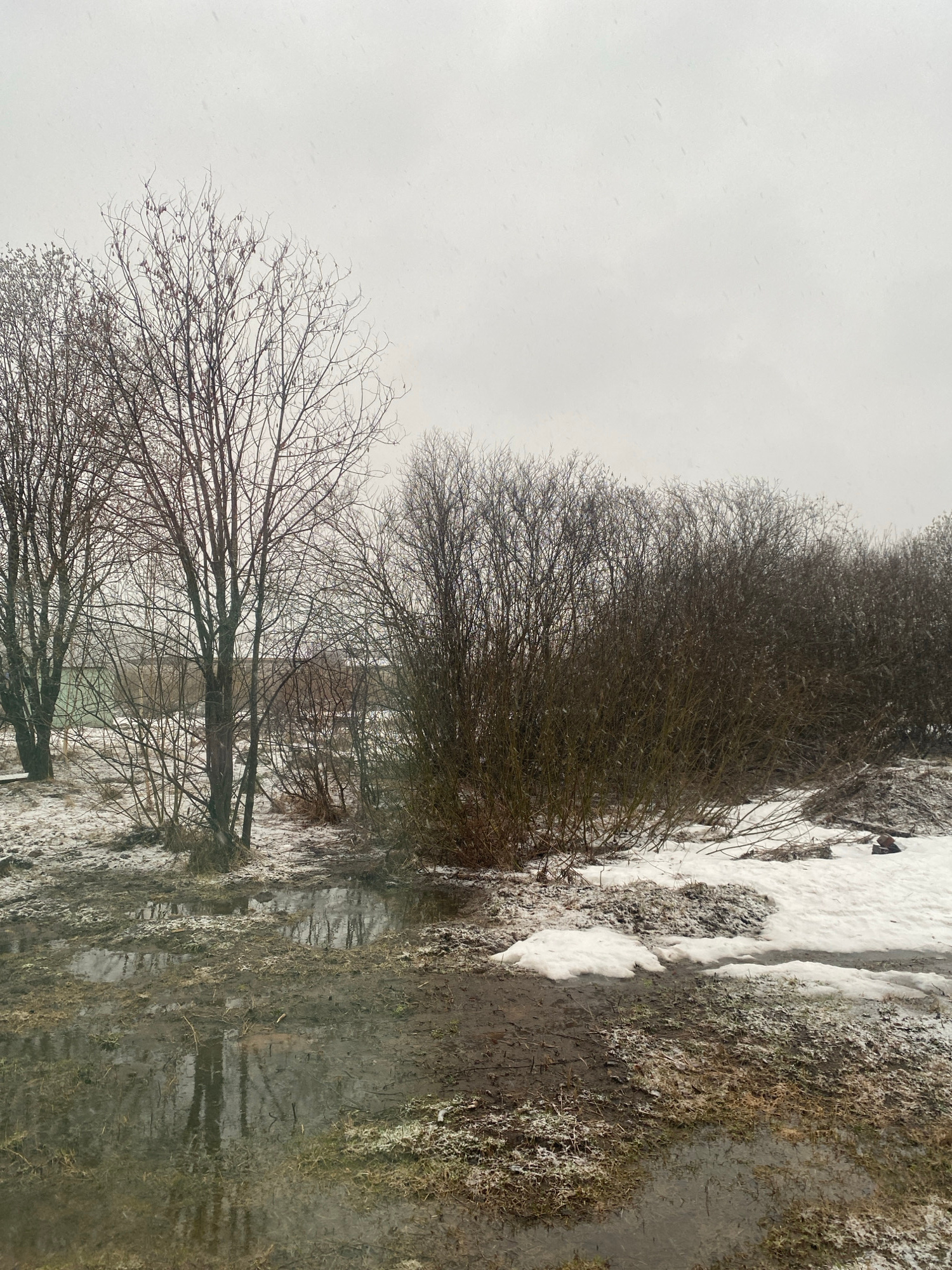 The image depicts a winter landscape in Izhevsk, Russia. A grey sky suggests an overcast day with light snow falling. The foreground features bare trees with thin branches, their forms reflected in a…read more