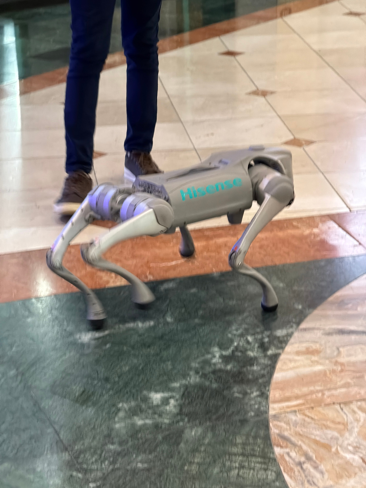 A robot dog, labeled with "Hisense" in large, teal letters, stands on a glossy floor of dark green marble and beige stone tile with terracotta colored accents. The robot is gray with white leg segment…read more