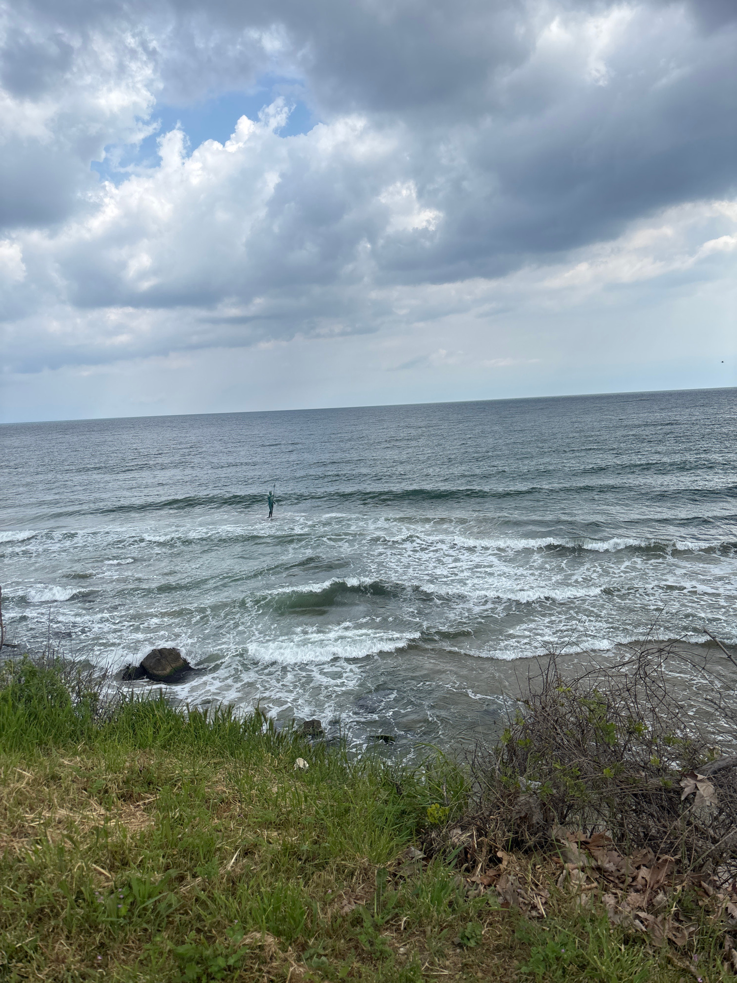The image shows a section of the coastline of Varna, Bulgaria, on a cloudy day. The grey sea is visible, with waves breaking near the shore. A solitary figure in the water appears to be surfing or pad…read more