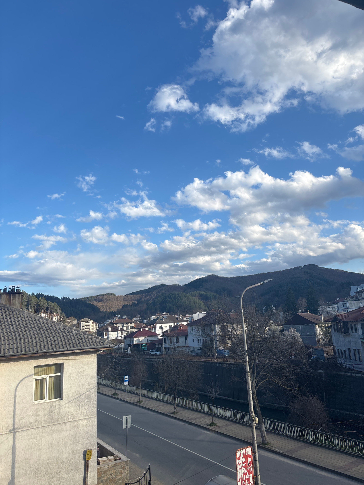 The image shows an elevated view from Zlatograd, Bulgaria. A clear blue sky with scattered white clouds is visible. In the background, a forested mountain rises. Closer to the camera, a street runs al…read more