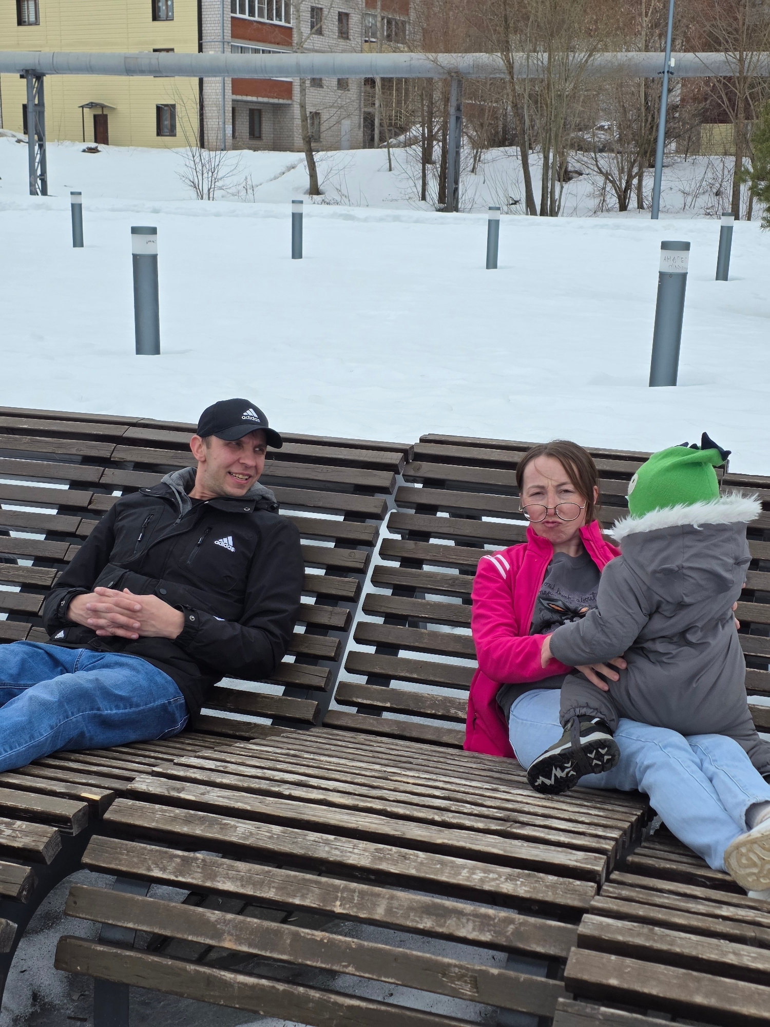 The image depicts a man and a girl sitting on a wooden bench in Votkinsk, Russia. Snow covers the ground and surrounding areas. The man is wearing a black Adidas jacket and a baseball cap. He is seate…read more
