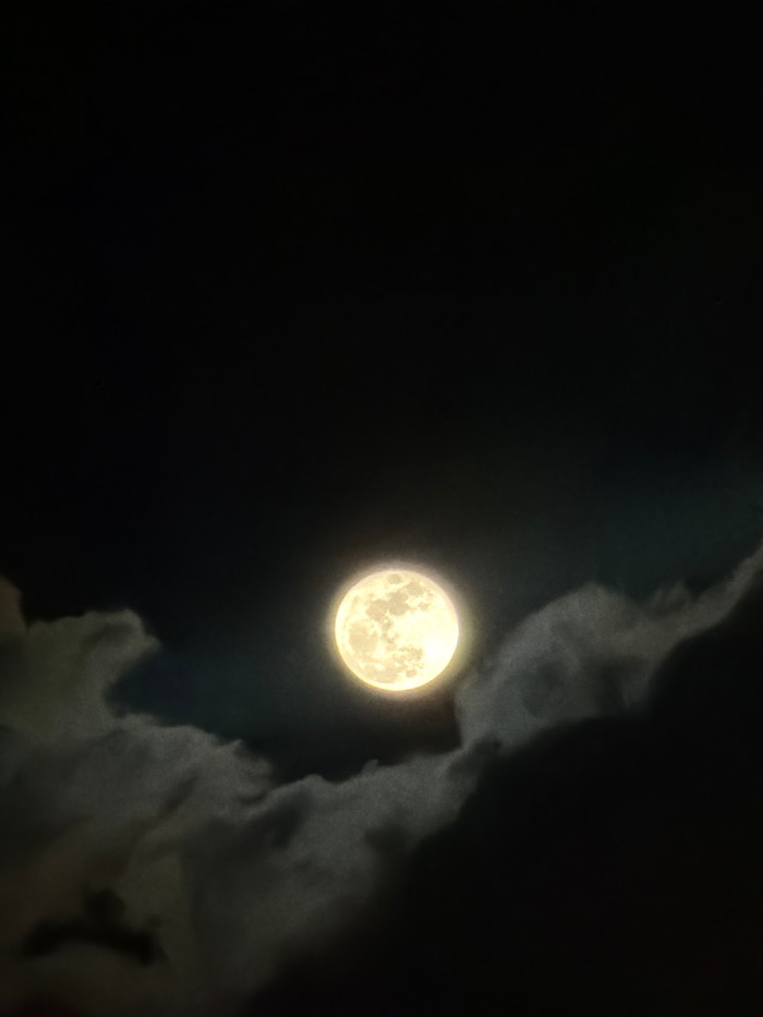 This vertical photograph captures a full, yellowish-white moon in the night sky, reportedly above Tel-Aviv, Israel. The moon, positioned slightly below the vertical center, displays prominent surface…read more