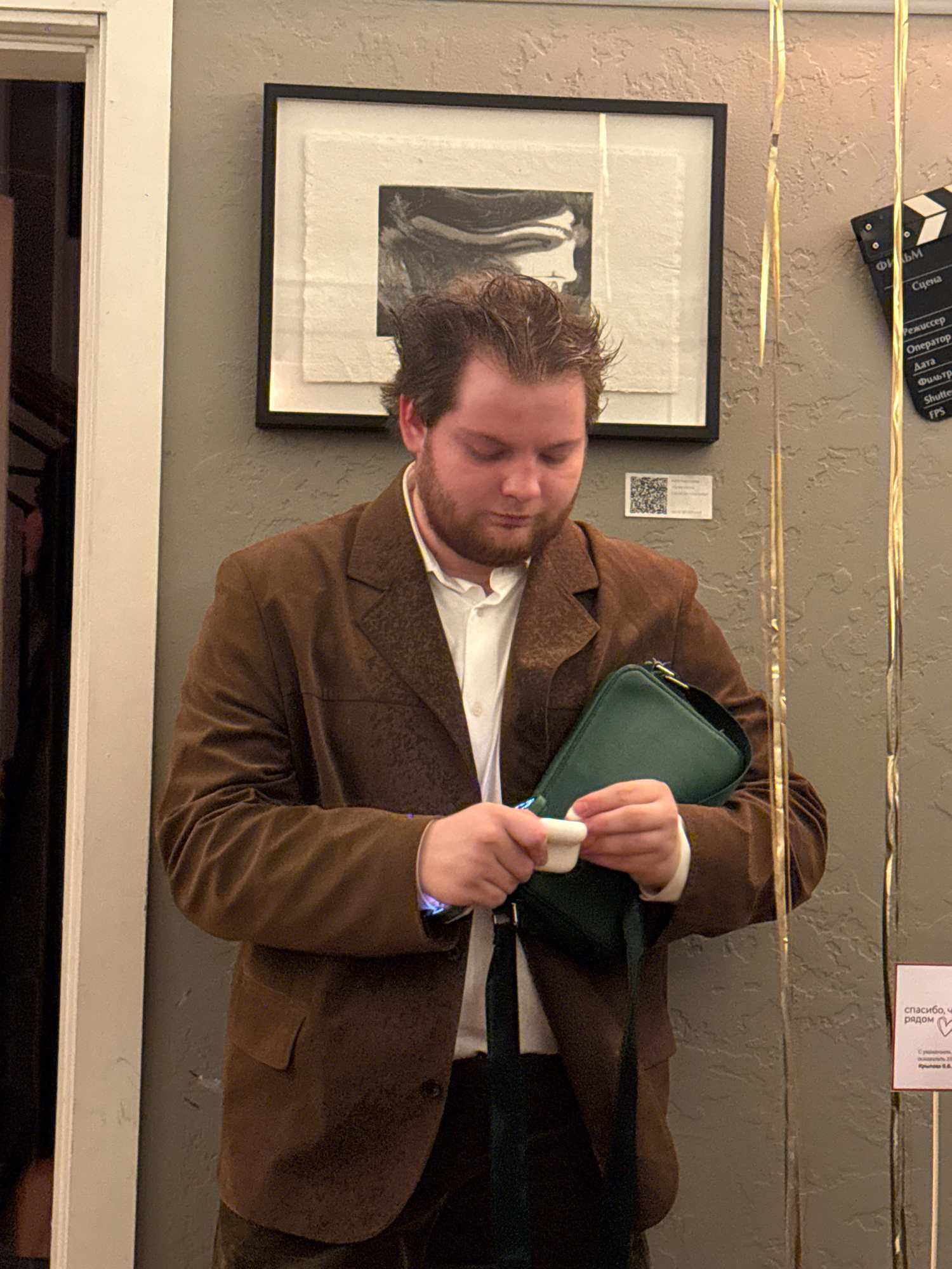 A man in a brown suit and white collared shirt is holding white earbuds in his hands. He is standing in front of a gray wall with a framed black and white picture. There is a green purse hanging on hi…read more