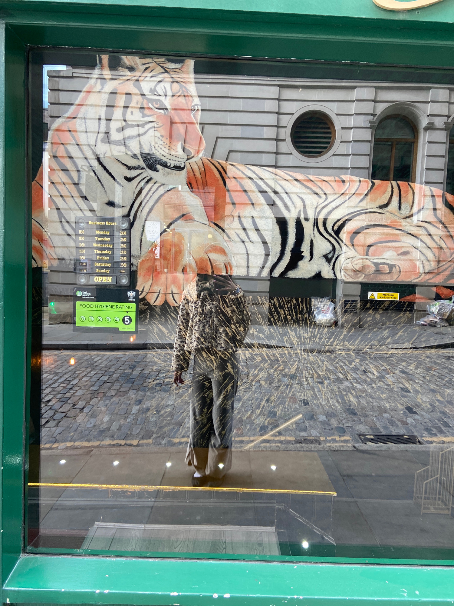 The image captures an urban street scene reflected in a shop window, which itself features a large, stylized graphic of a tiger. The tiger, depicted with distinctive black, white, and orange stripes,…read more