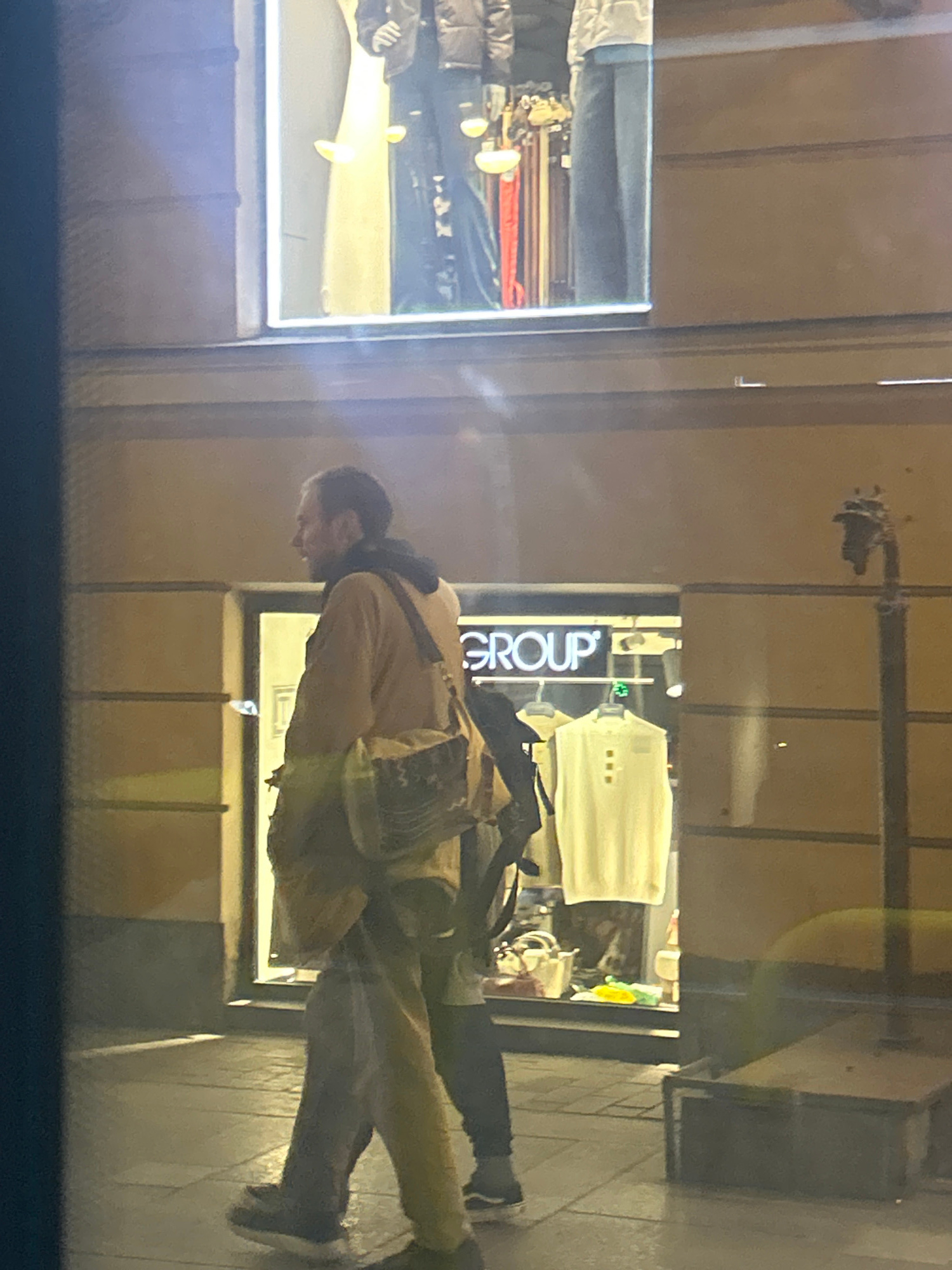 This image captures an urban street scene at night or dusk, likely in a commercial area, given the brightly lit shop windows. The primary subject is a man, viewed in profile, walking past the storefro…read more