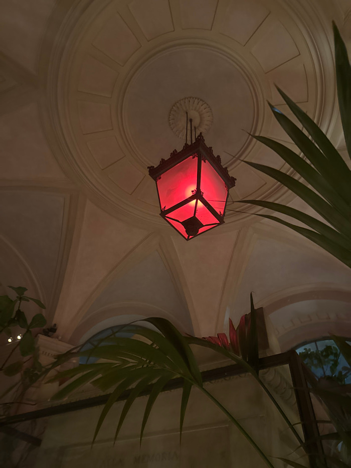 An interior, low-angle photograph captures an ornate, red lantern-style light fixture suspended from a decorative, vaulted ceiling. The ceiling, appearing in shades of light beige or off-white, featur…read more