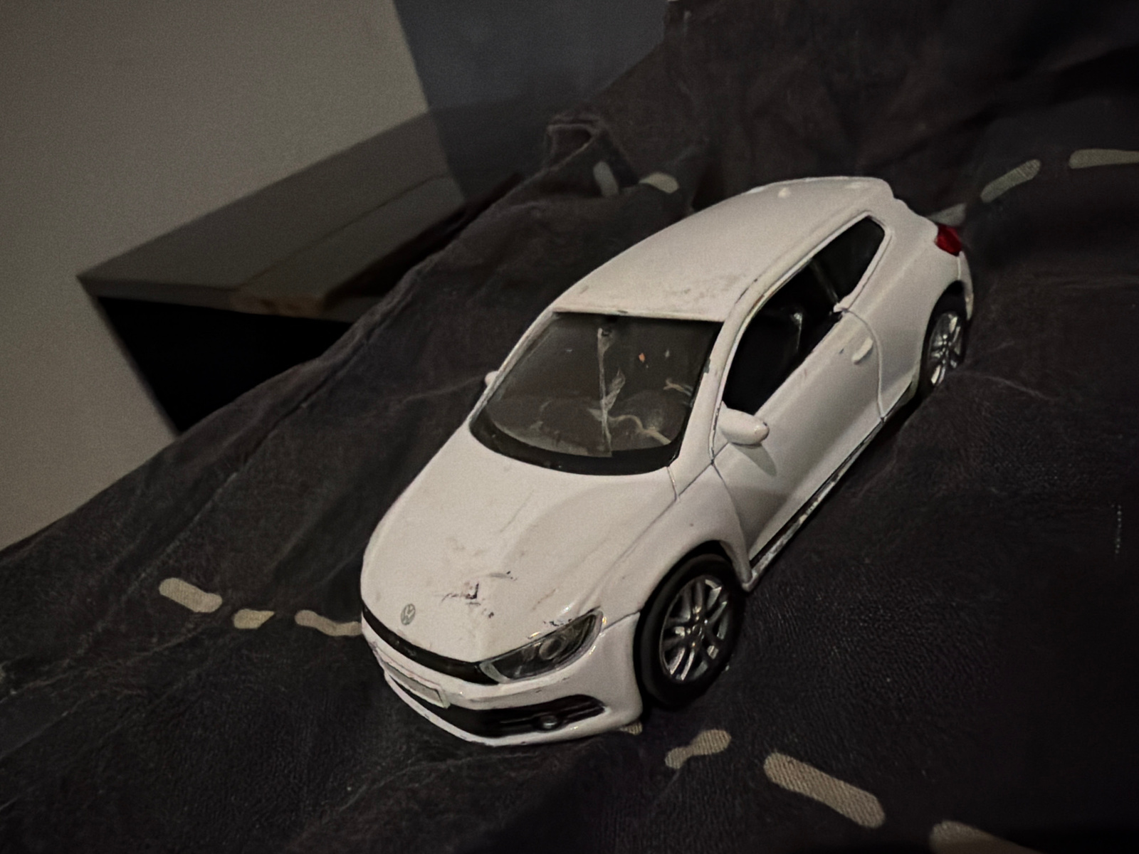 A white toy car, resembling a Volkswagen Scirocco, is the central subject of the image. The car displays visible signs of wear and tear, including scuffs and dirt on its white paintwork, particularly…read more