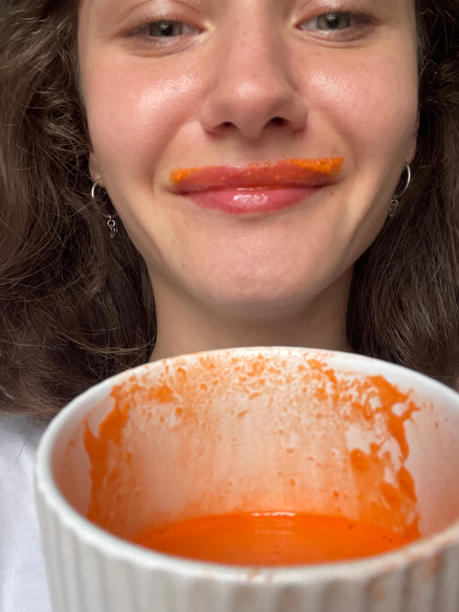 A woman with fair skin and brown hair poses at an angle while holding a white cup filled with an orange liquid. Some of the liquid is smeared on her upper lip, resembling a mustache. The woman has gre…read more