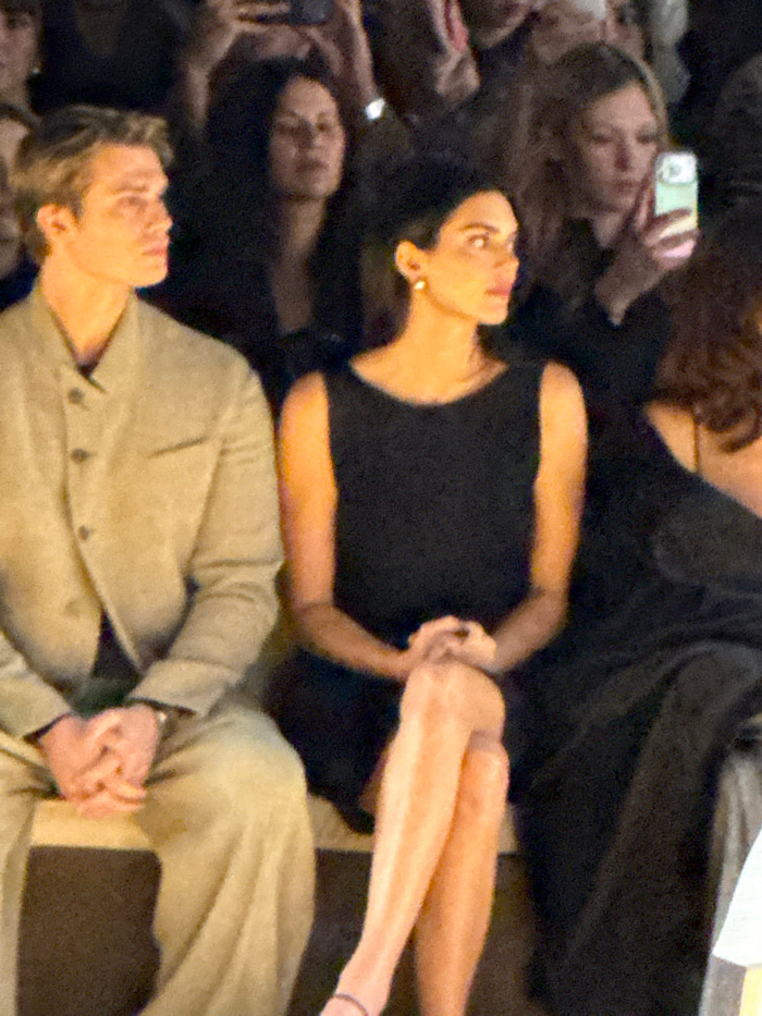 Two individuals, a male and a female, are seated side-by-side in the foreground of an indoor, dimly lit environment, consistent with a public event such as a fashion show in Milan, Italy. The male, on…read more