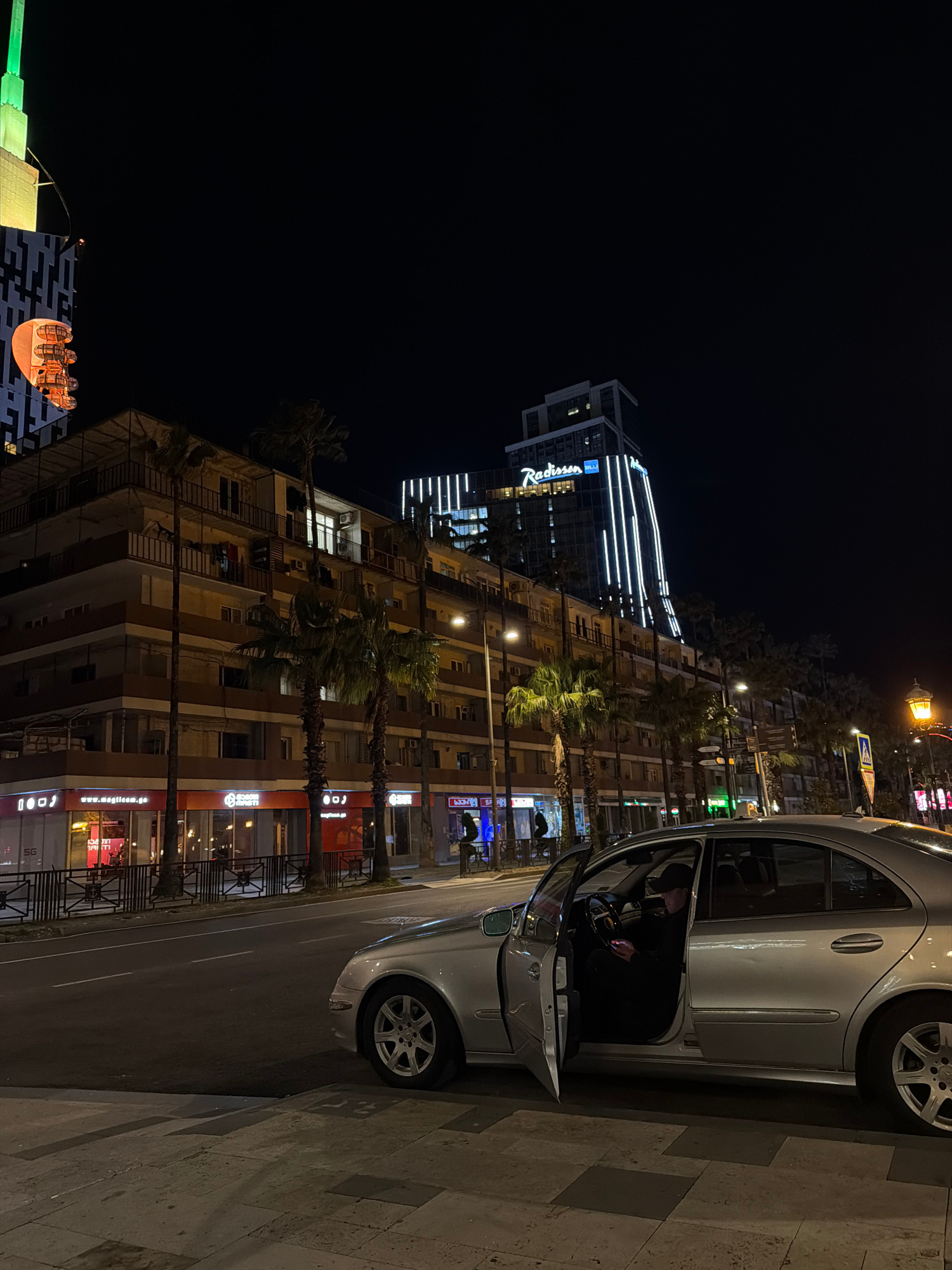 Captured at night in Batumi, Georgia, the image features a silver Mercedes-Benz parked on a sidewalk adjacent to a multi-story building, with its driver-side door ajar, revealing a person inside. Theβ¦read more