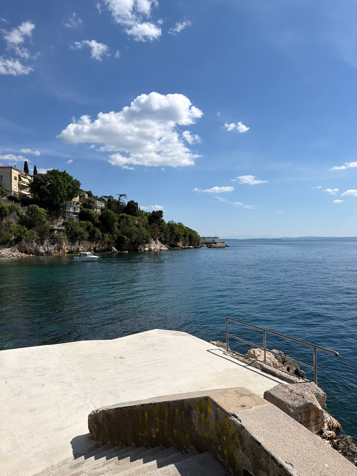 This image captures a vibrant, sunny coastal scene, likely along the Adriatic Sea in Grad Rijeka, Croatia. The perspective is from a concrete platform or walkway overlooking the water and a lush green…read more