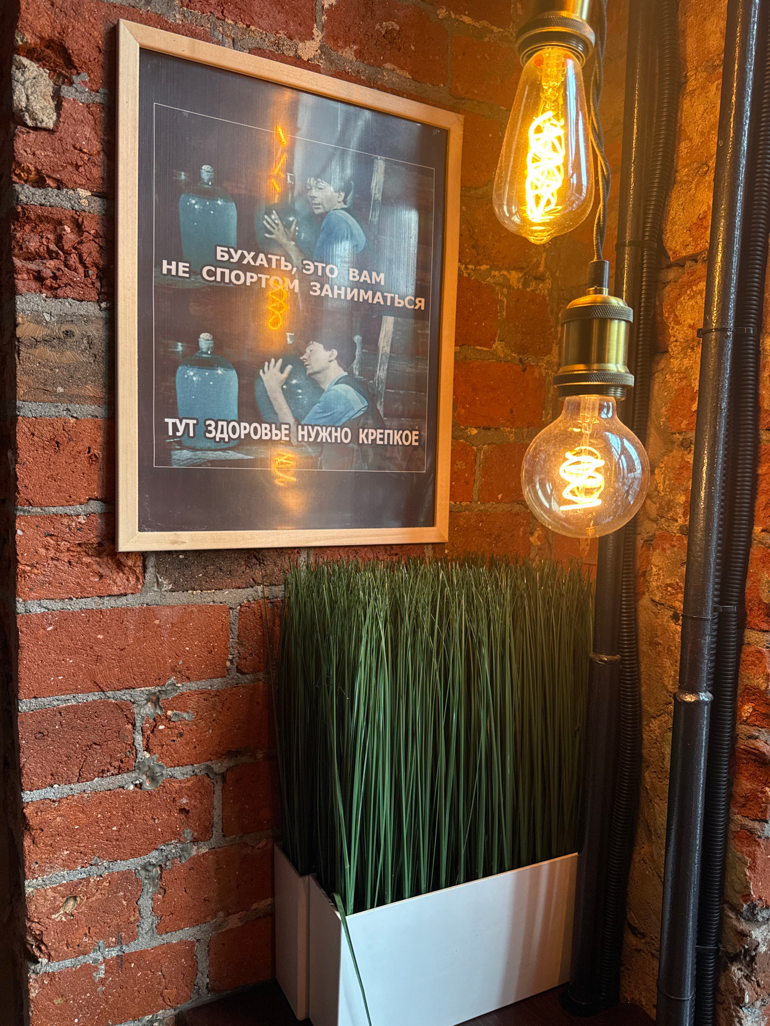 A close-up shot reveals an interior brick wall. Two Edison-style light bulbs, one teardrop-shaped and the other round, hang from a black metal pipe running along the top of the wall. Below the lights,…read more
