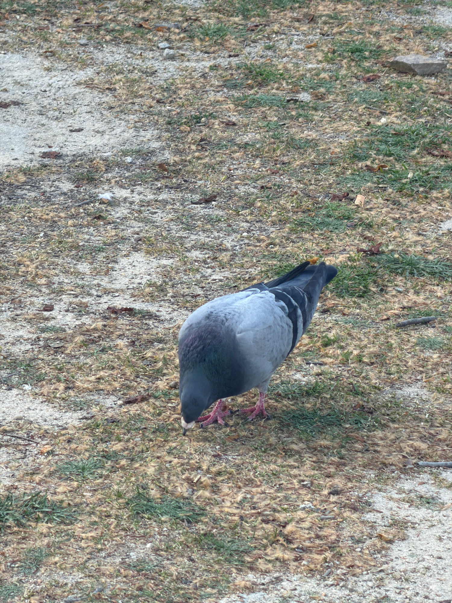 A medium-high-angle close-up shows a pigeon foraging on a patchy ground cover of sand, faded green grasses, and dead plant matter in a city environment. The bird is centered, facing diagonally upwards…read more