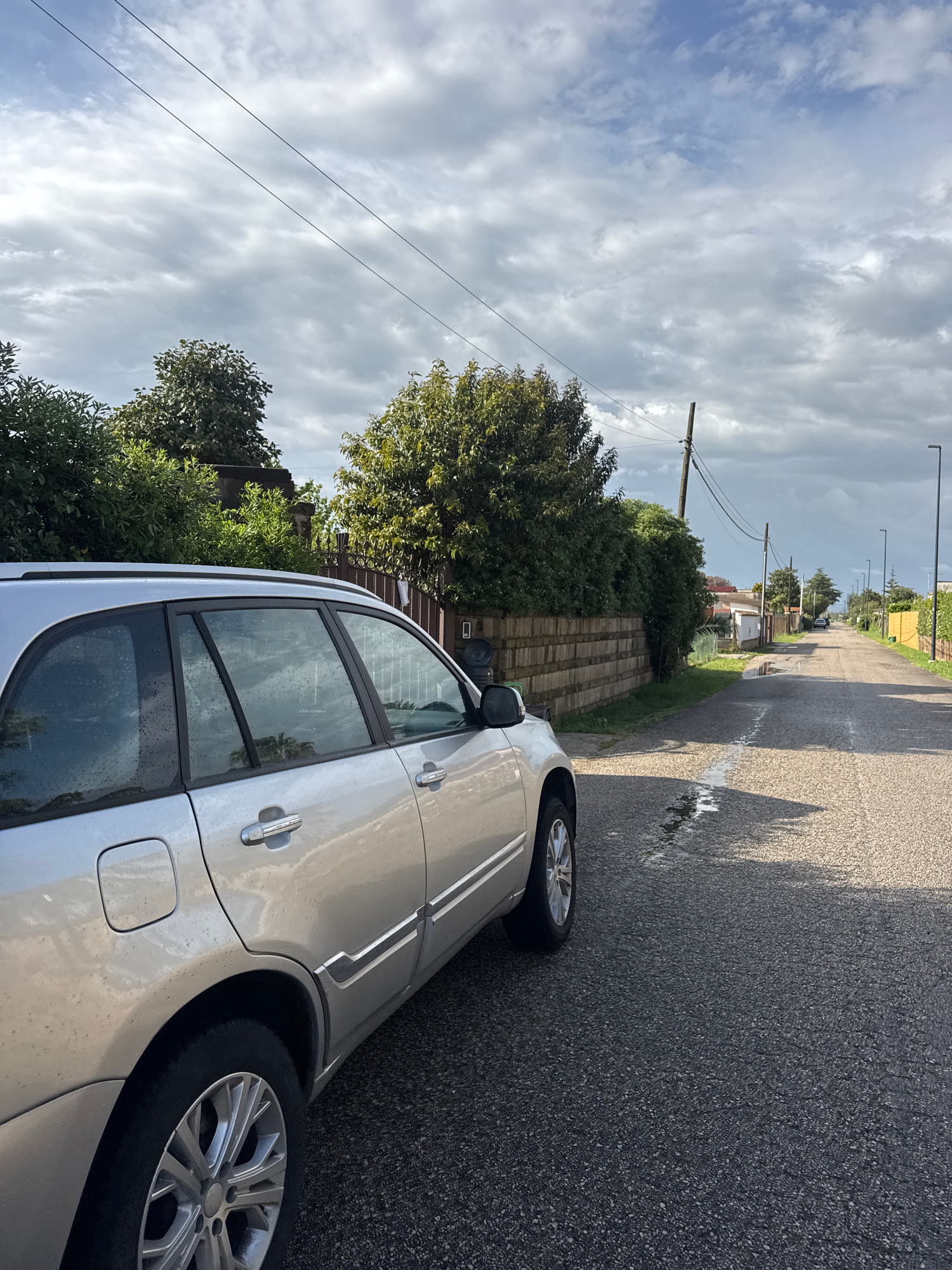 The image depicts a silver car parked on a street in Aprilia, Italy. The road is paved and shows signs of recent rain. A fence and green foliage line the left side of the street, and a row of houses i…read more