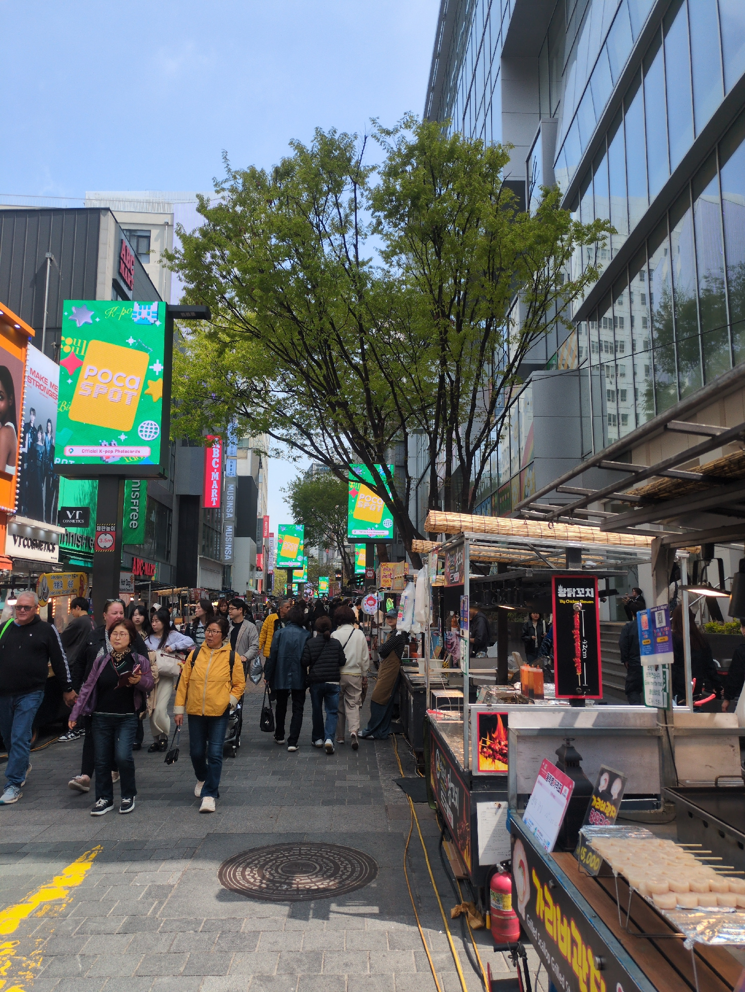 A street in Seoul, South Korea is crowded with pedestrians. Street food vendors line one side of the street, with signs in Korean advertising their offerings. A large tree provides shade over the stre…read more