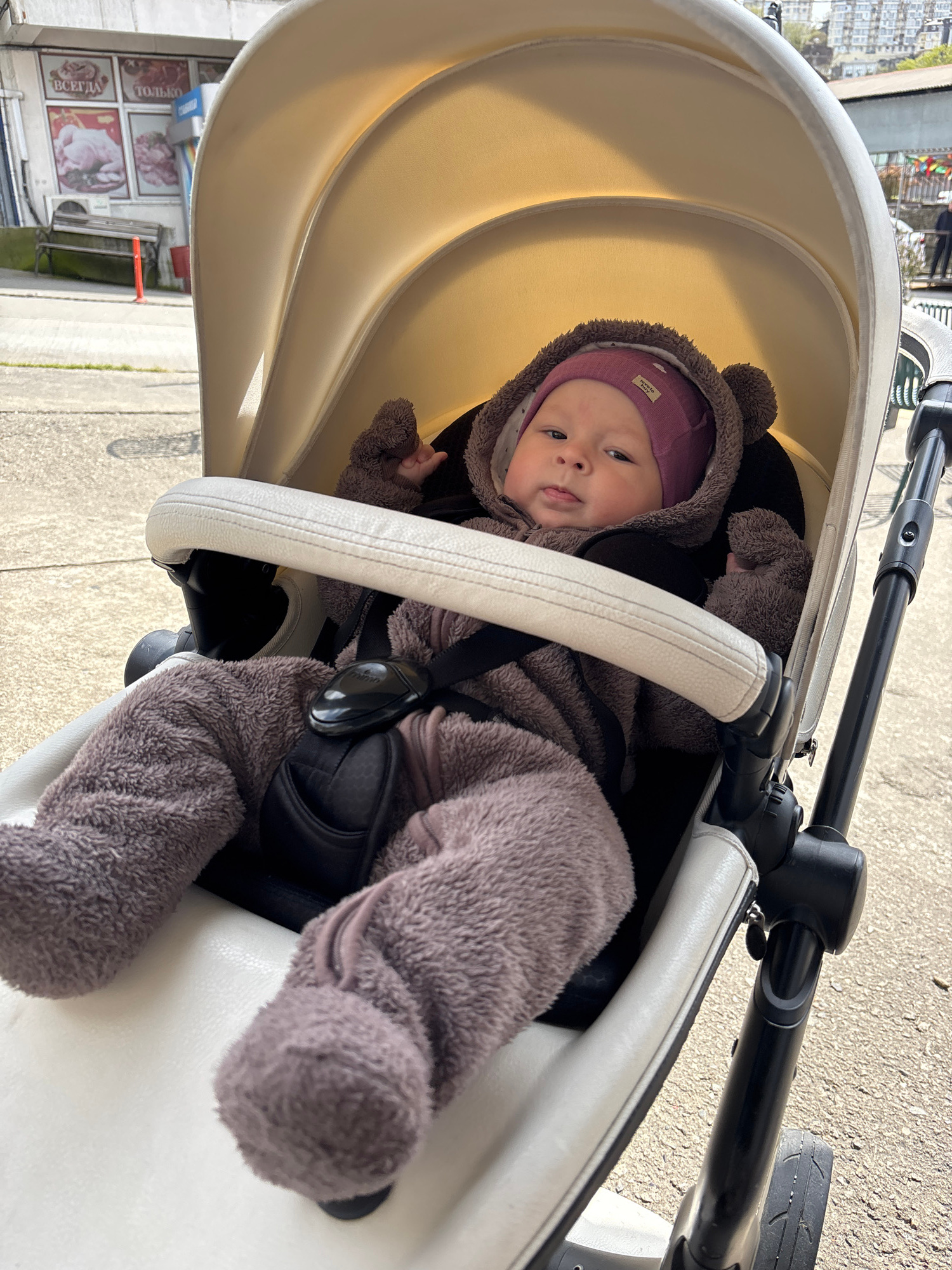A baby wearing a purple hat and fuzzy brown jumpsuit is sitting in a white stroller. The stroller is on a paved surface, and a building with signs in Russian, possibly a shop, is visible in the backgr…read more