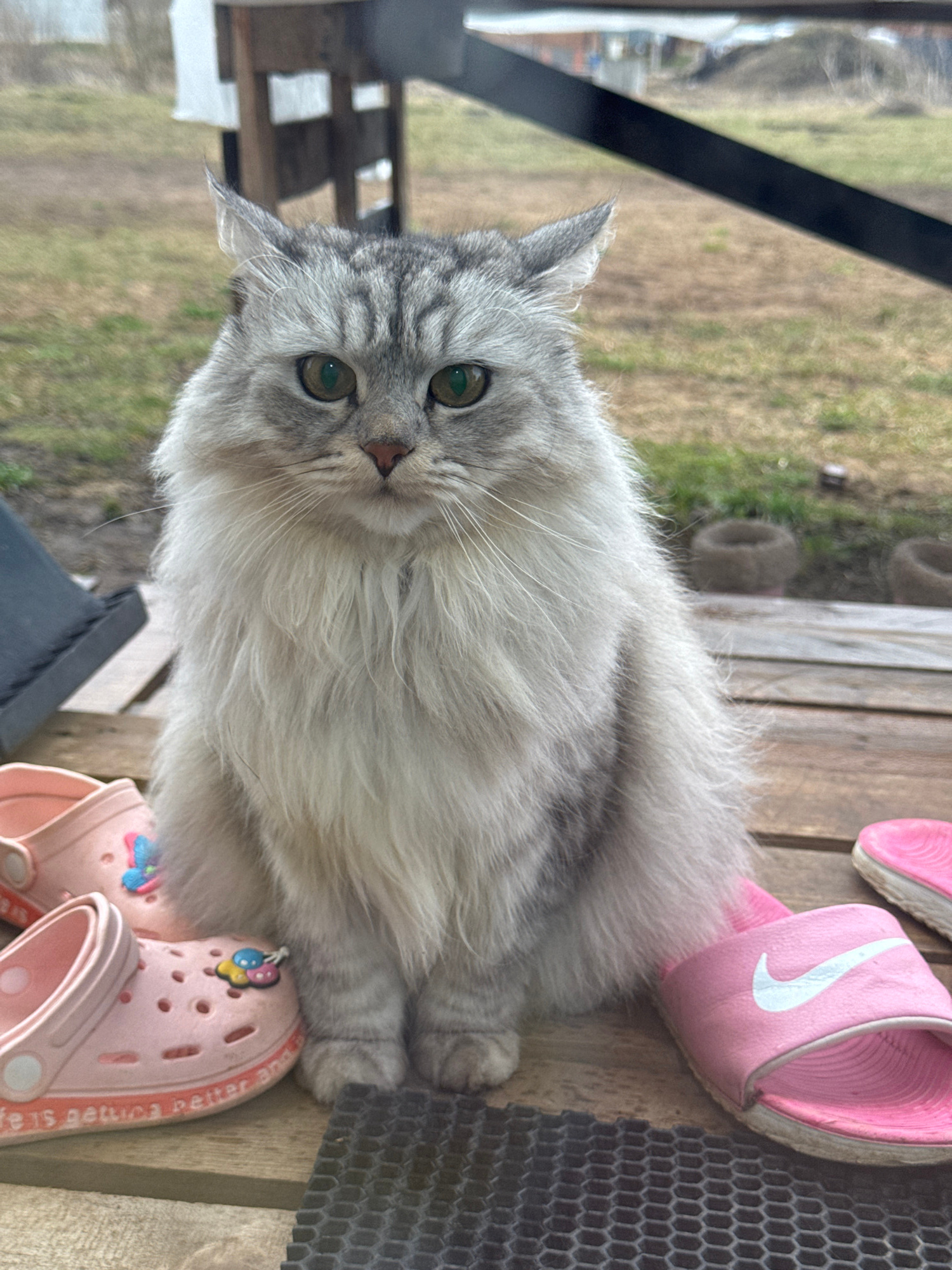 A grey and white cat is sitting on a wooden surface, next to pink sandals. The cat has green eyes and a fluffy coat. One sandal has a Nike logo on it, and the other sandal is a Croc with a flower deco…read more