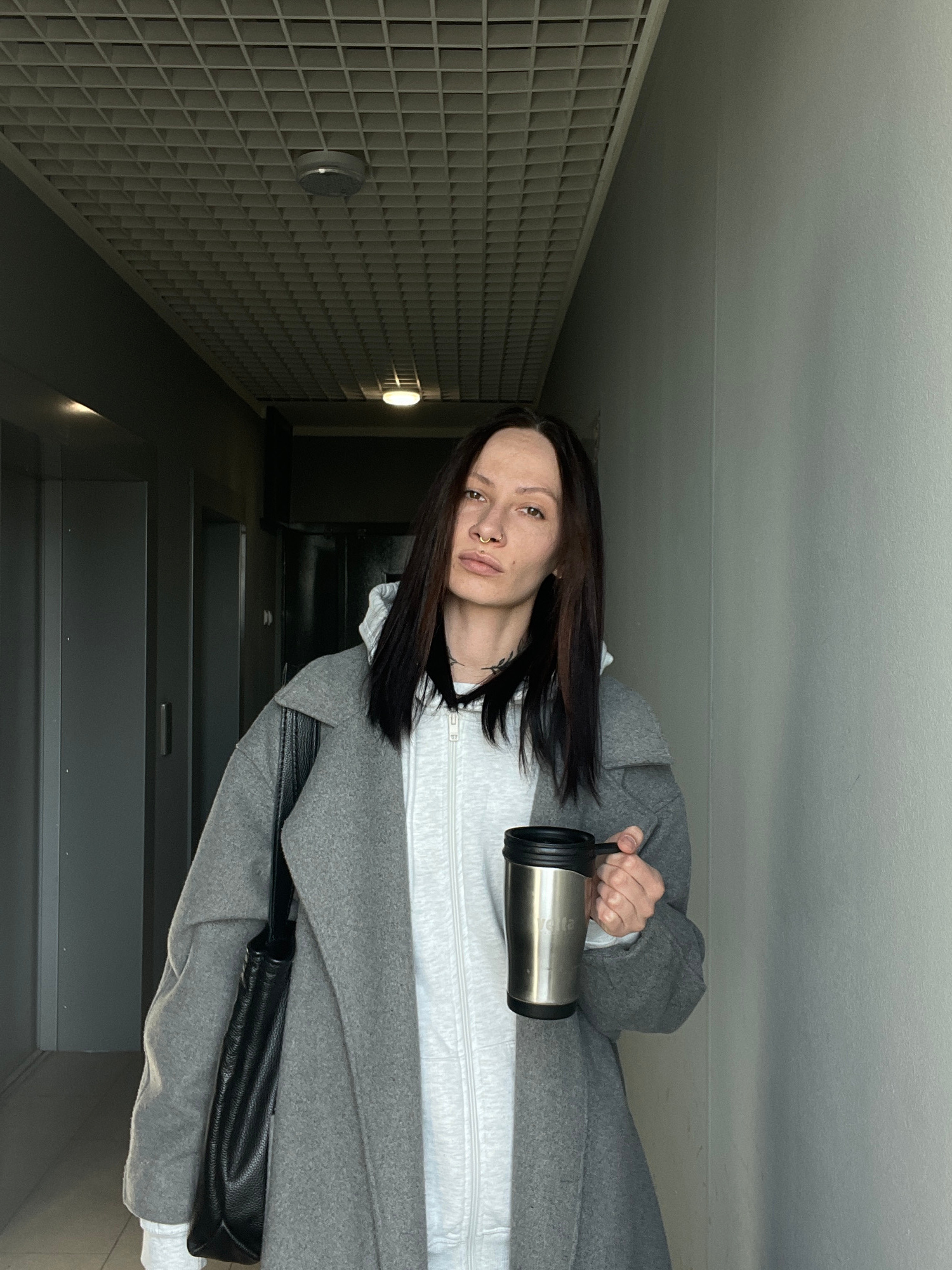 A young woman stands indoors, holding a silver mug. She is wearing a grey coat over a white zippered hoodie. A black leather purse hangs from her shoulder. The location appears to be a modern building…read more