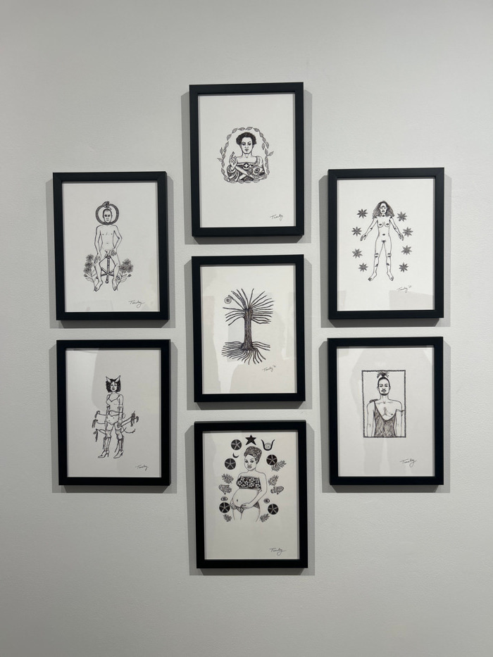 Seven framed black-and-white ink drawings are displayed on a plain white wall, likely within a gallery or exhibition space in the city of Los Angeles, United States of America. The frames are black, e…read more