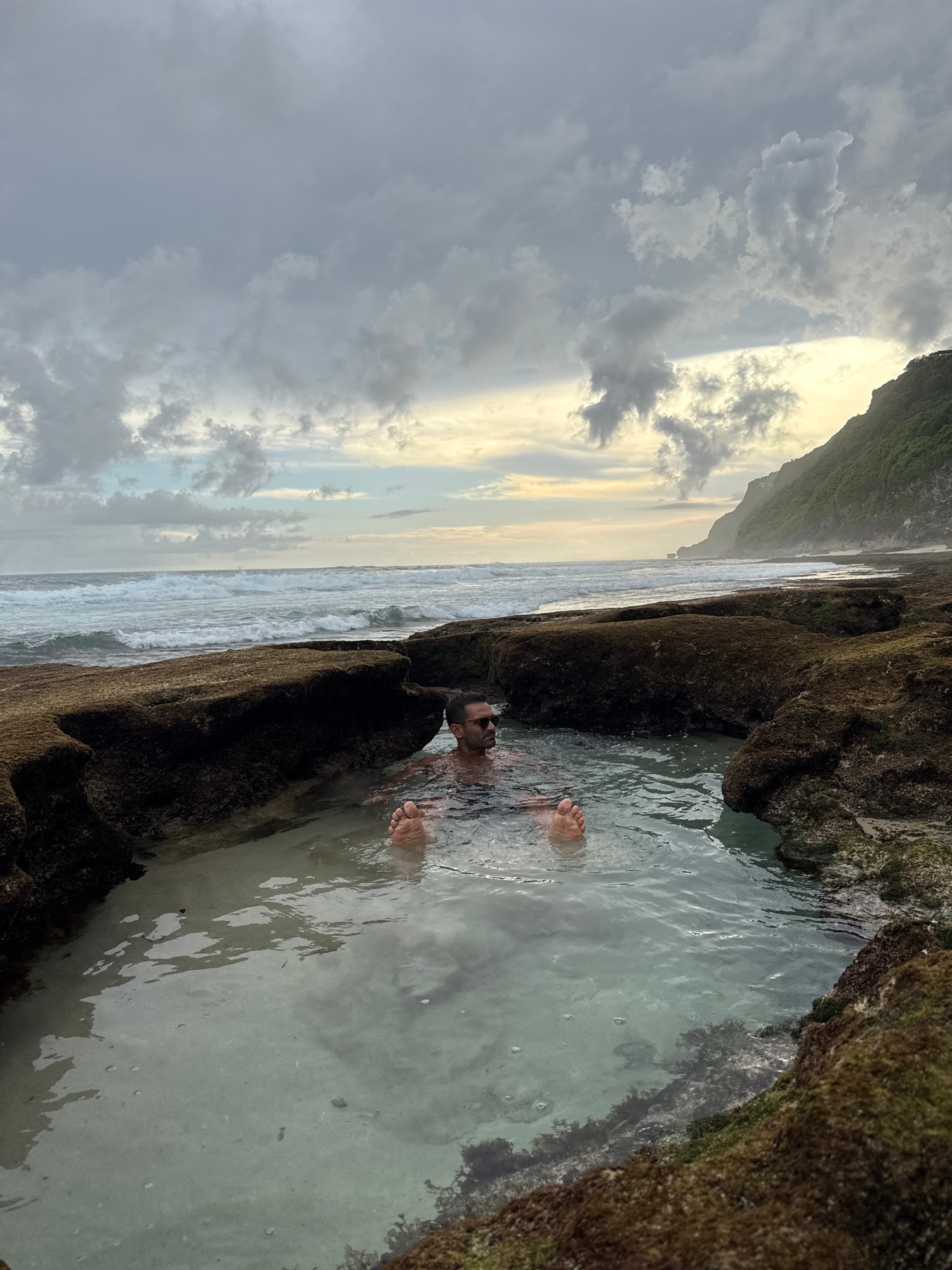 A person is immersed in a tide pool at the edge of the ocean near Pecatu, Indonesia. Rocky, moss-covered formations define the pool’s edges. The person's feet and upper body are visible above the surf…read more