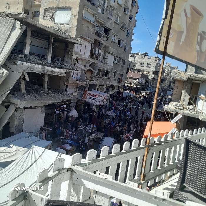 This image provides an elevated view of a busy street in Khan Yunis, Palestinian Territory, flanked by heavily damaged multi-story concrete buildings. The buildings on both sides exhibit significant s…read more