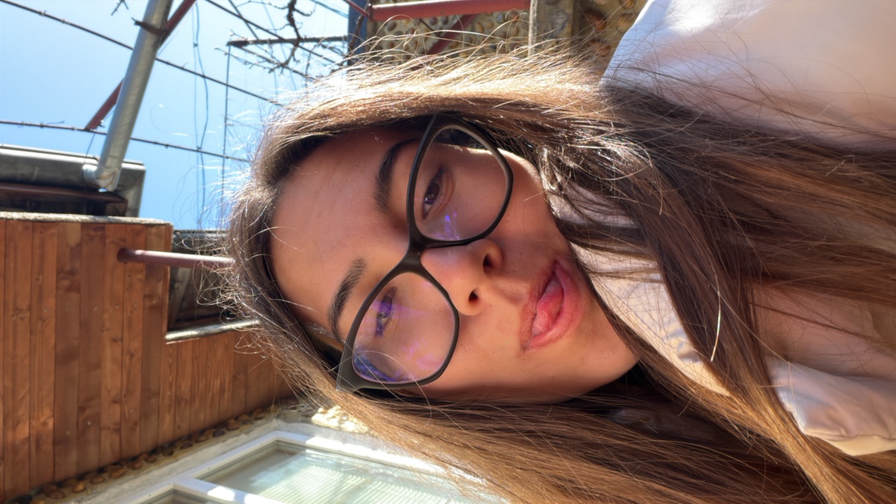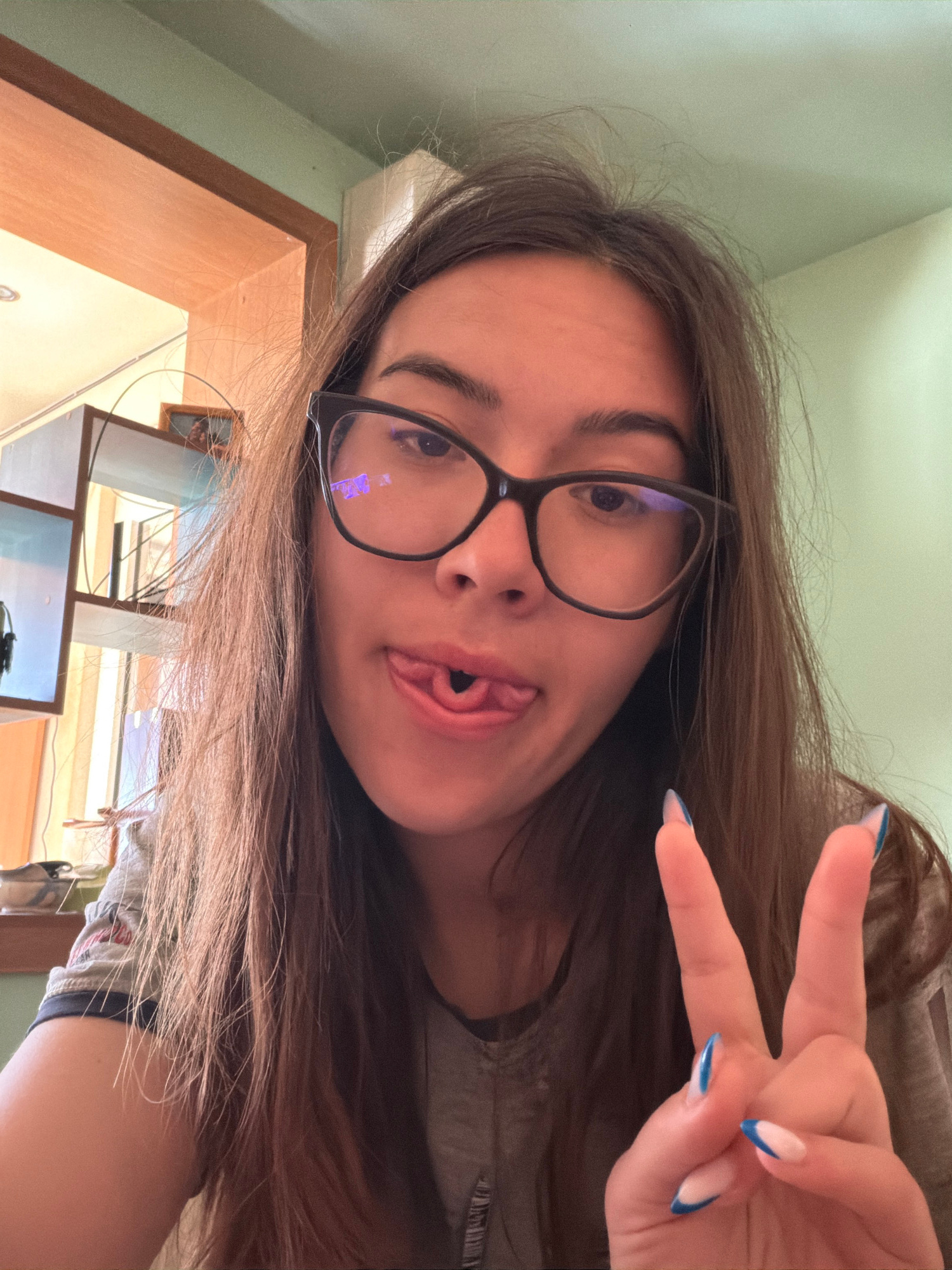 A young woman with light brown hair is taking a selfie indoors. She is wearing black-rimmed glasses and a gray top. She is sticking her tongue out and making a peace sign with her right hand, showingβ¦read more