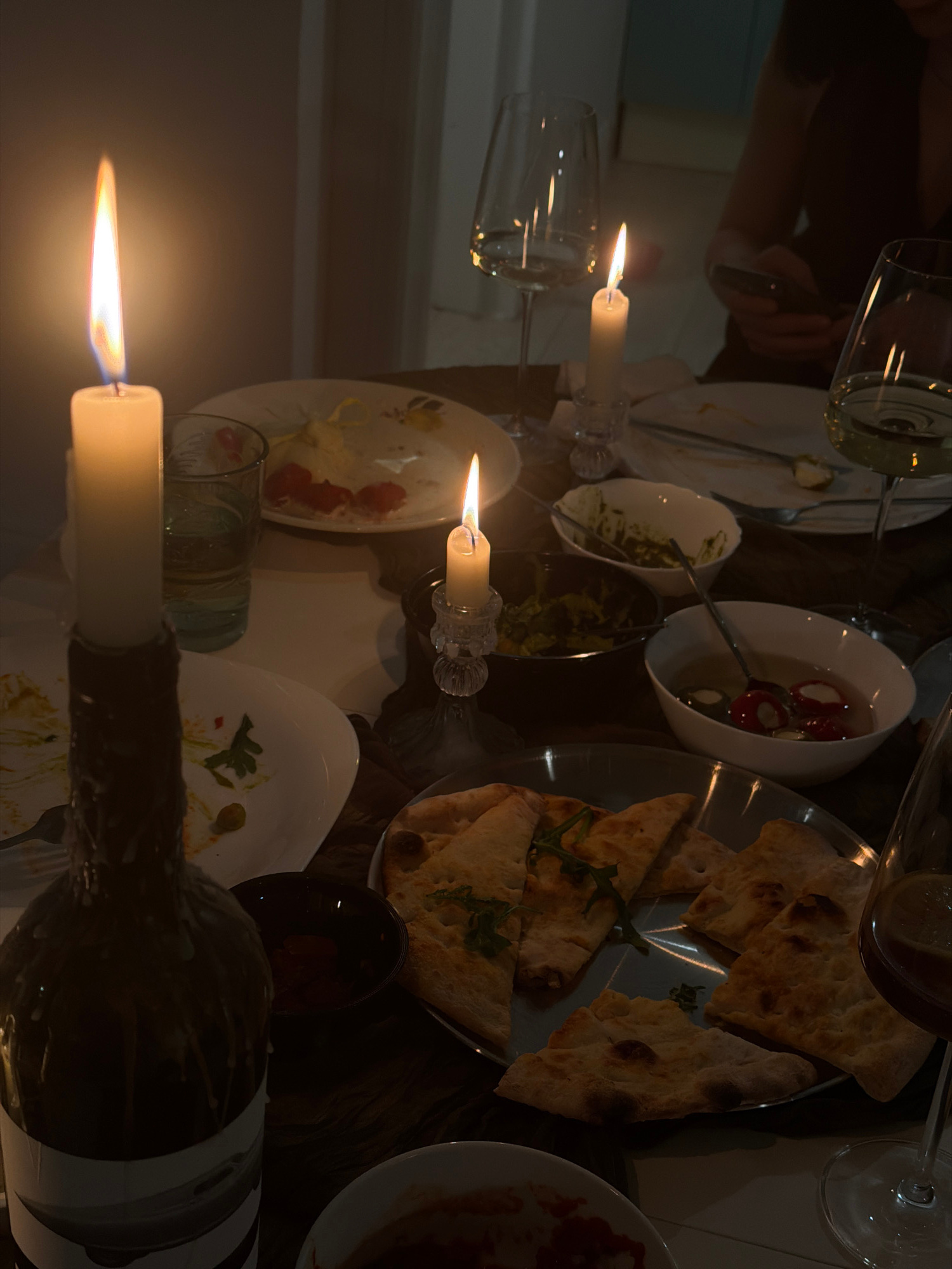 The image depicts a dimly lit dining table. Several plates with food remains are scattered around. There are also bowls with various fillings, wine glasses, and lit candles. The candles appear to be t…read more