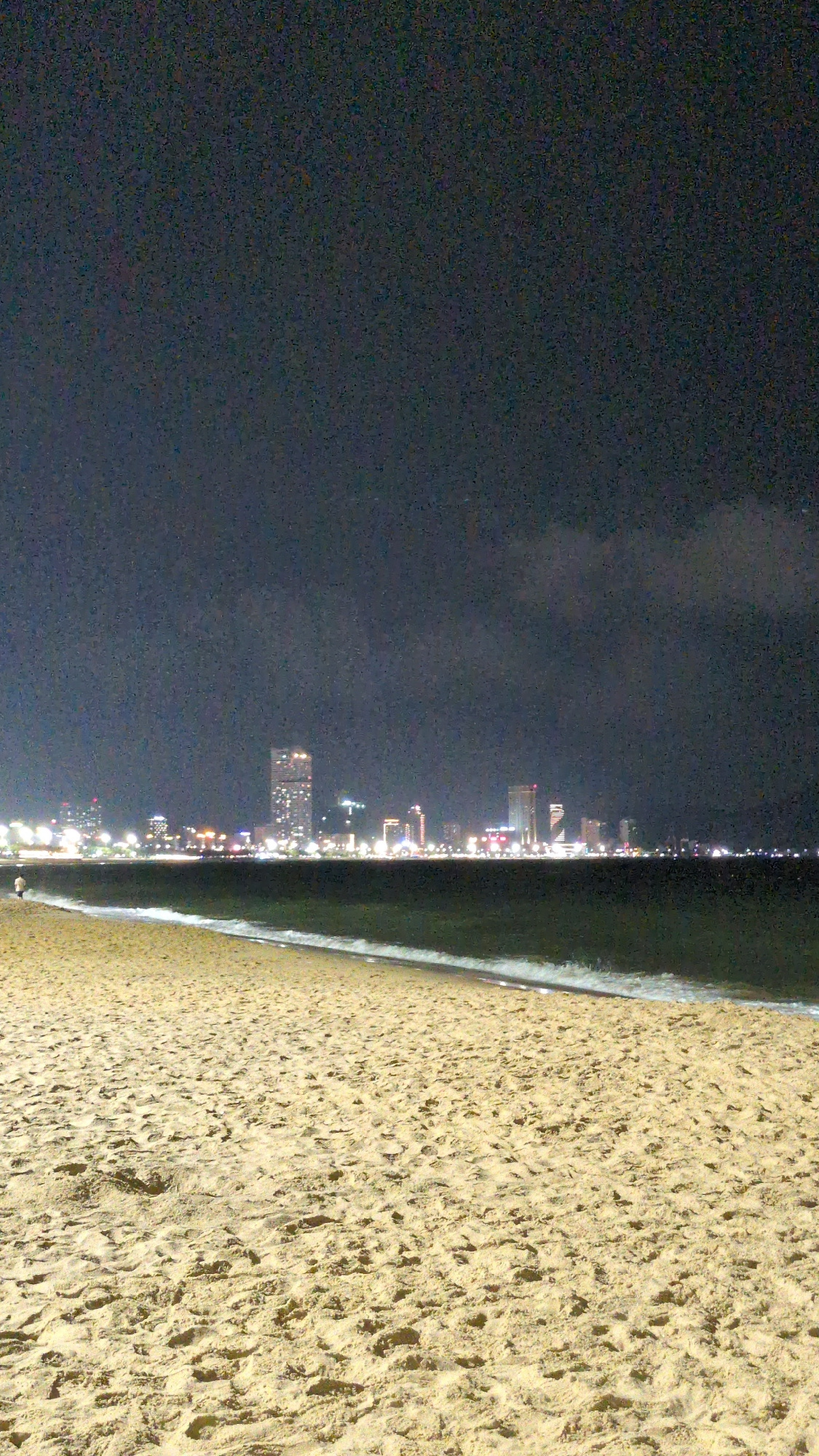 At night, the city of South Quy Nhon Ward, Vietnam is seen along the coastline. The city is dimly lit with lights from buildings and streetlights. The beach is in the foreground. The sky is dark.