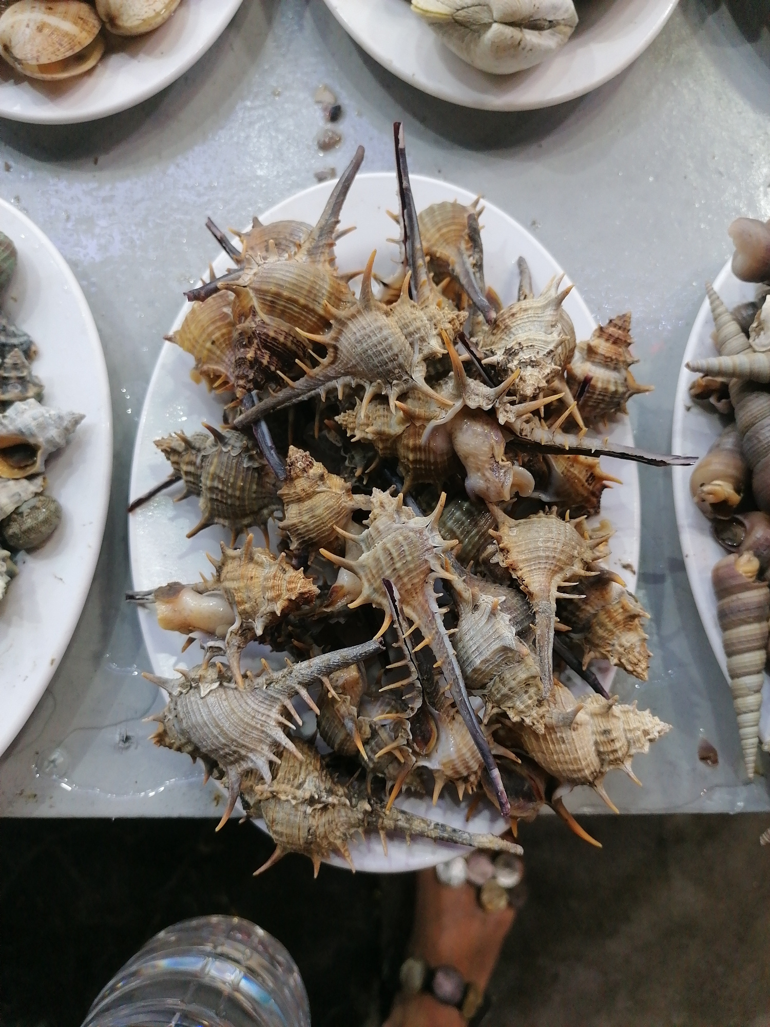 This close-up shot captures an abundant display of various fresh shellfish, likely presented for sale or consumption at a market or restaurant in Bai Chay Ward, Vietnam. The central and most prominen…read more