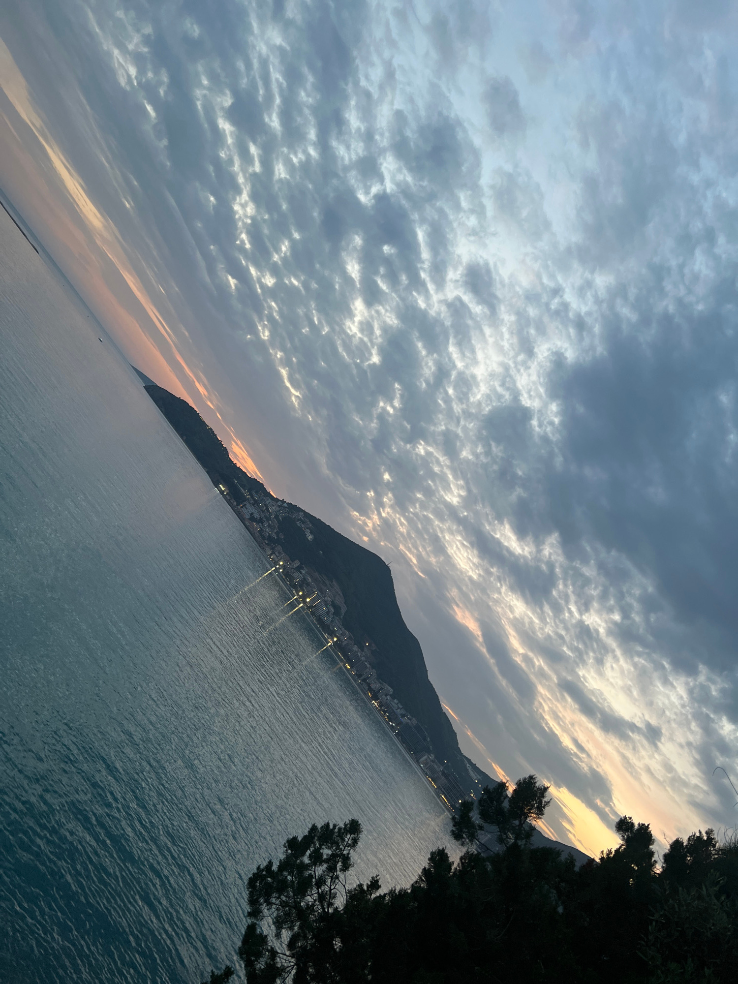 This image presents a serene coastal landscape captured at dusk or dawn, strongly suggesting the location of Boreti, Montenegro, as provided. The photograph is composed with a distinct diagonal tilt,…read more