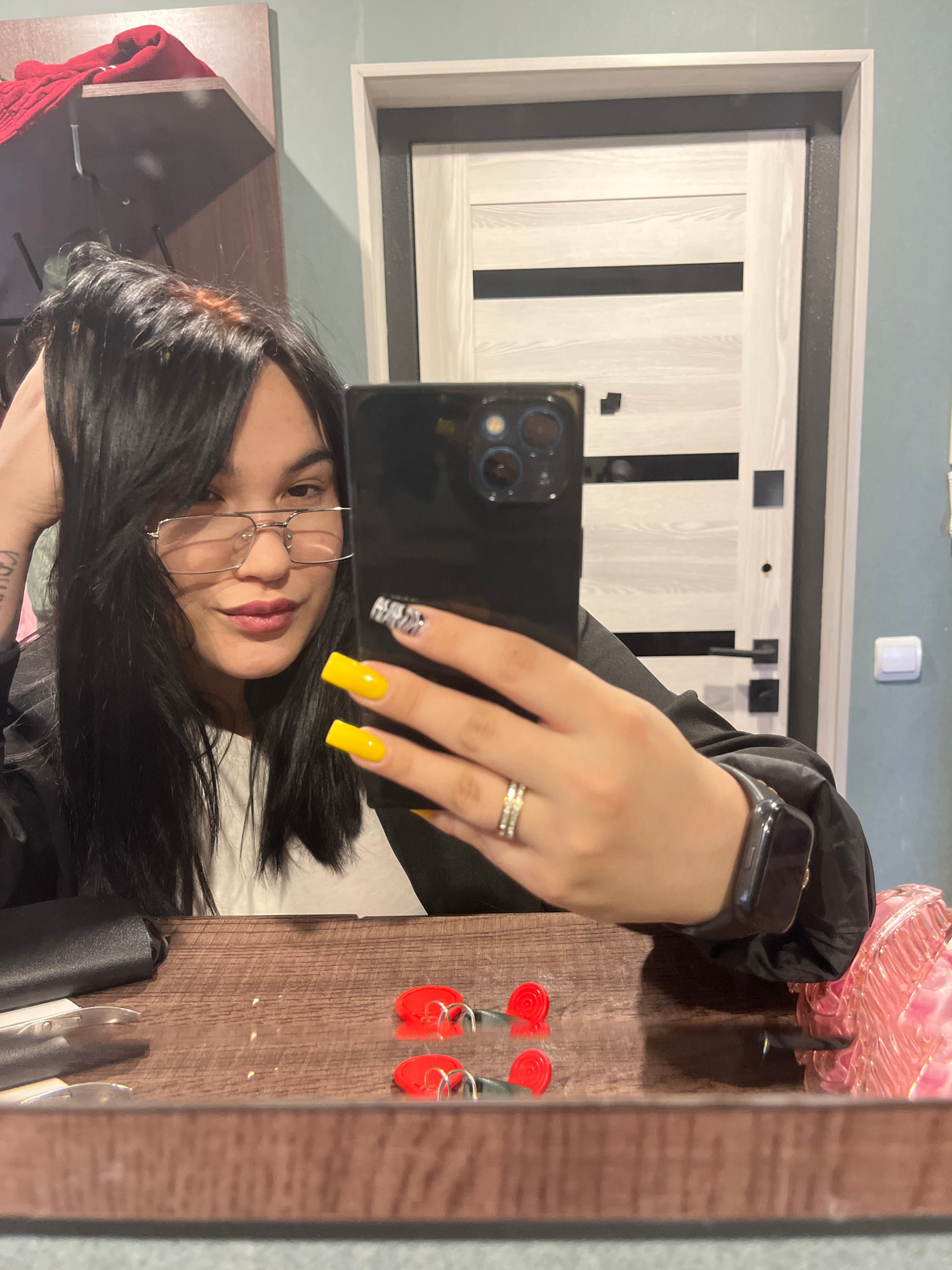 This media file contains a mirror selfie, originally rotated 90 degrees clockwise, featuring a young woman indoors. **Subjects:** * **Person:** A young woman with long, dark hair, wearing glasses a…read more