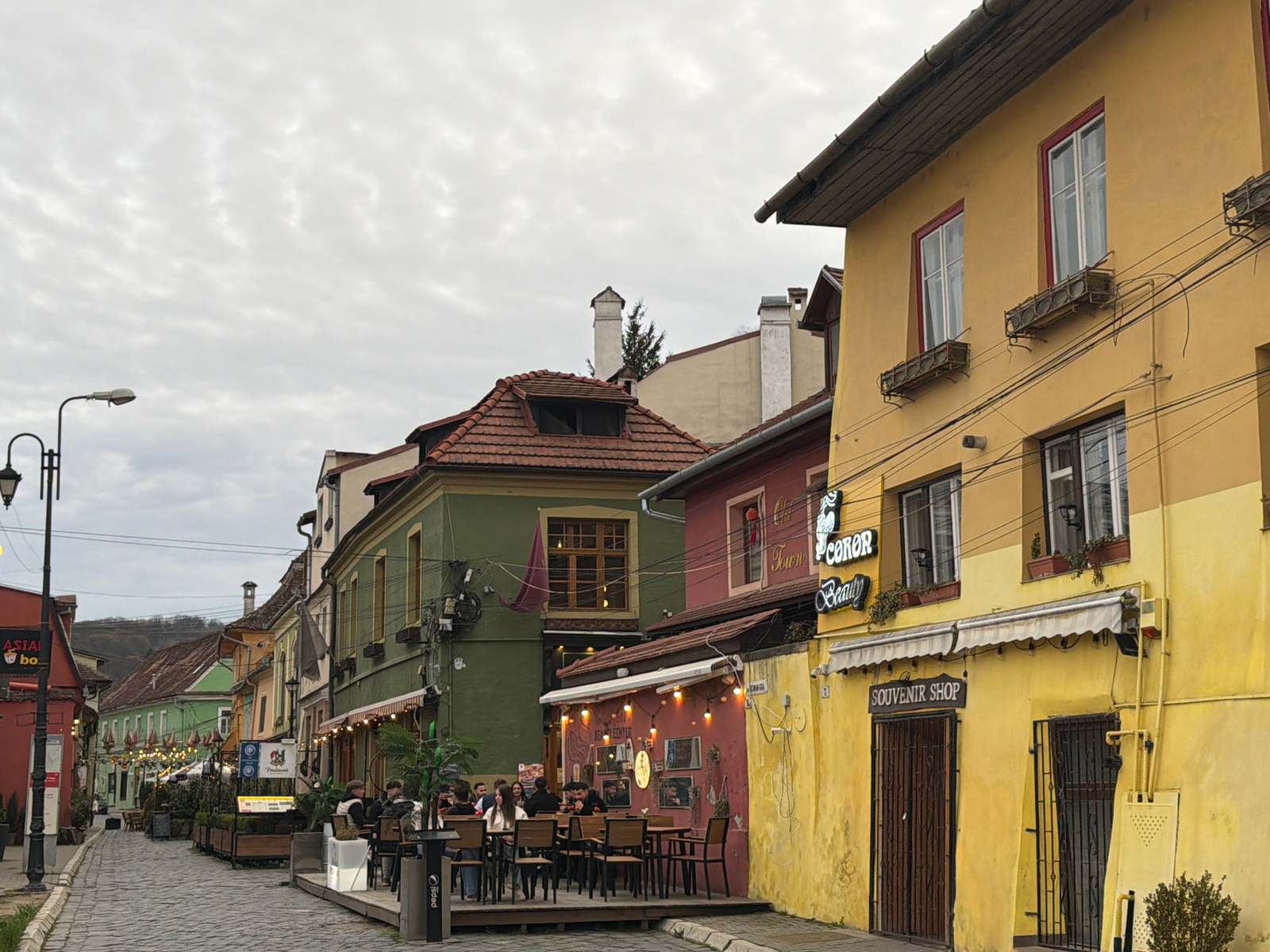 The image shows a street scene in Sighișoara, Romania. The street is paved with cobblestones and lined with colorful buildings. Several people are seated at tables outside of a restaurant on a raised…read more