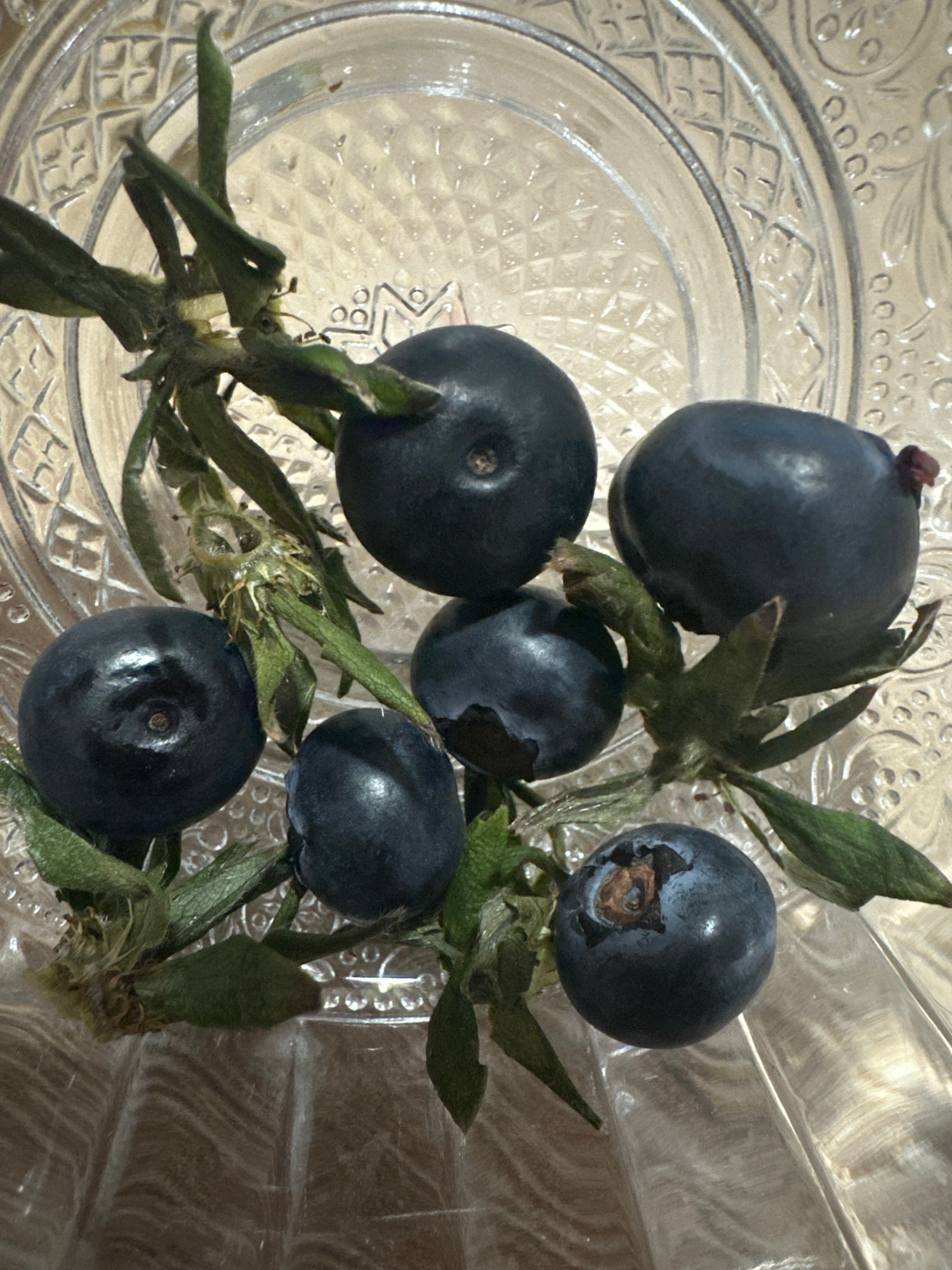 The image shows a cluster of blueberries still attached to their stems and leaves, placed inside a decorative glass bowl. The blueberries are deep blue and vary in size. Some have visible imperfection…read more