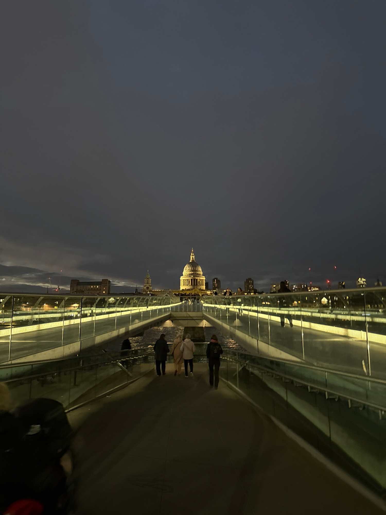 The image captures a nighttime view from the Millennium Bridge in London, United Kingdom, looking east towards St. Paul's Cathedral. The cathedral, centrally positioned, is brightly illuminated, its d…read more