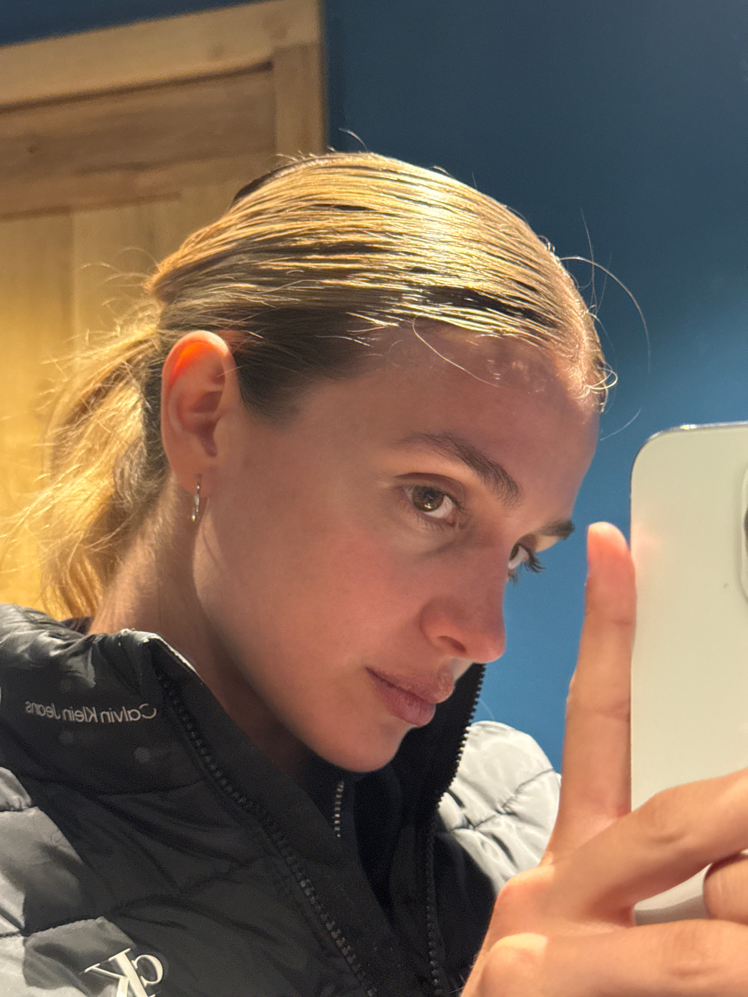 The image shows a person with light hair and fair skin taking a selfie. The person is wearing a black Calvin Klein jacket. The background consists of a blue sky and a glimpse of a wooden structure. Th…read more