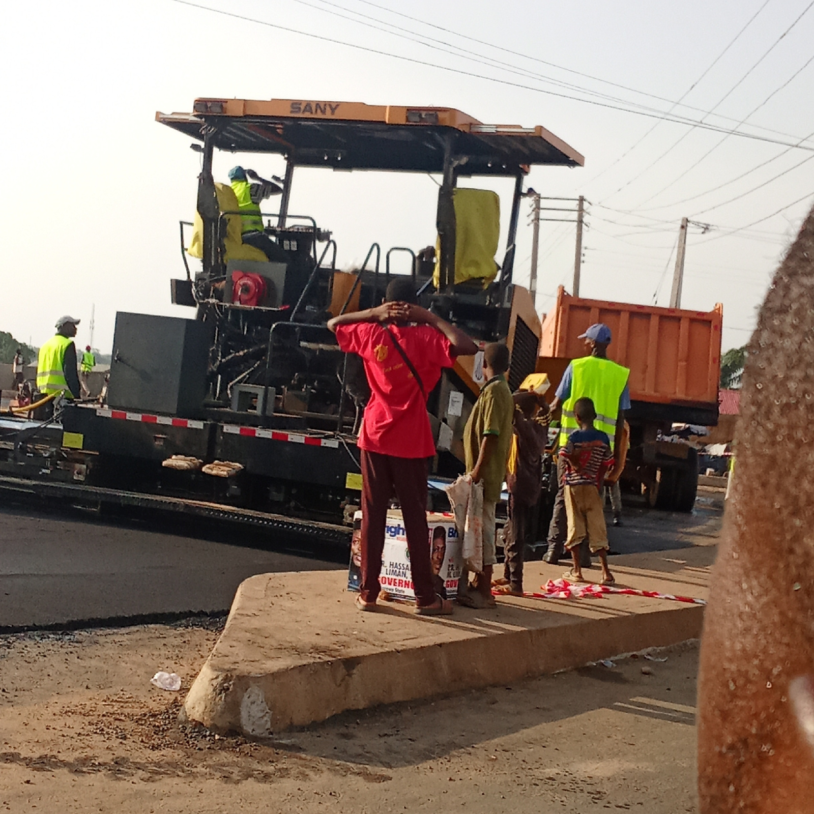 The image depicts road construction taking place in Akwanga, Nigeria. A yellow SANY brand asphalt paving machine is laying new asphalt on the road, operated by a construction worker wearing a yellow v…read more