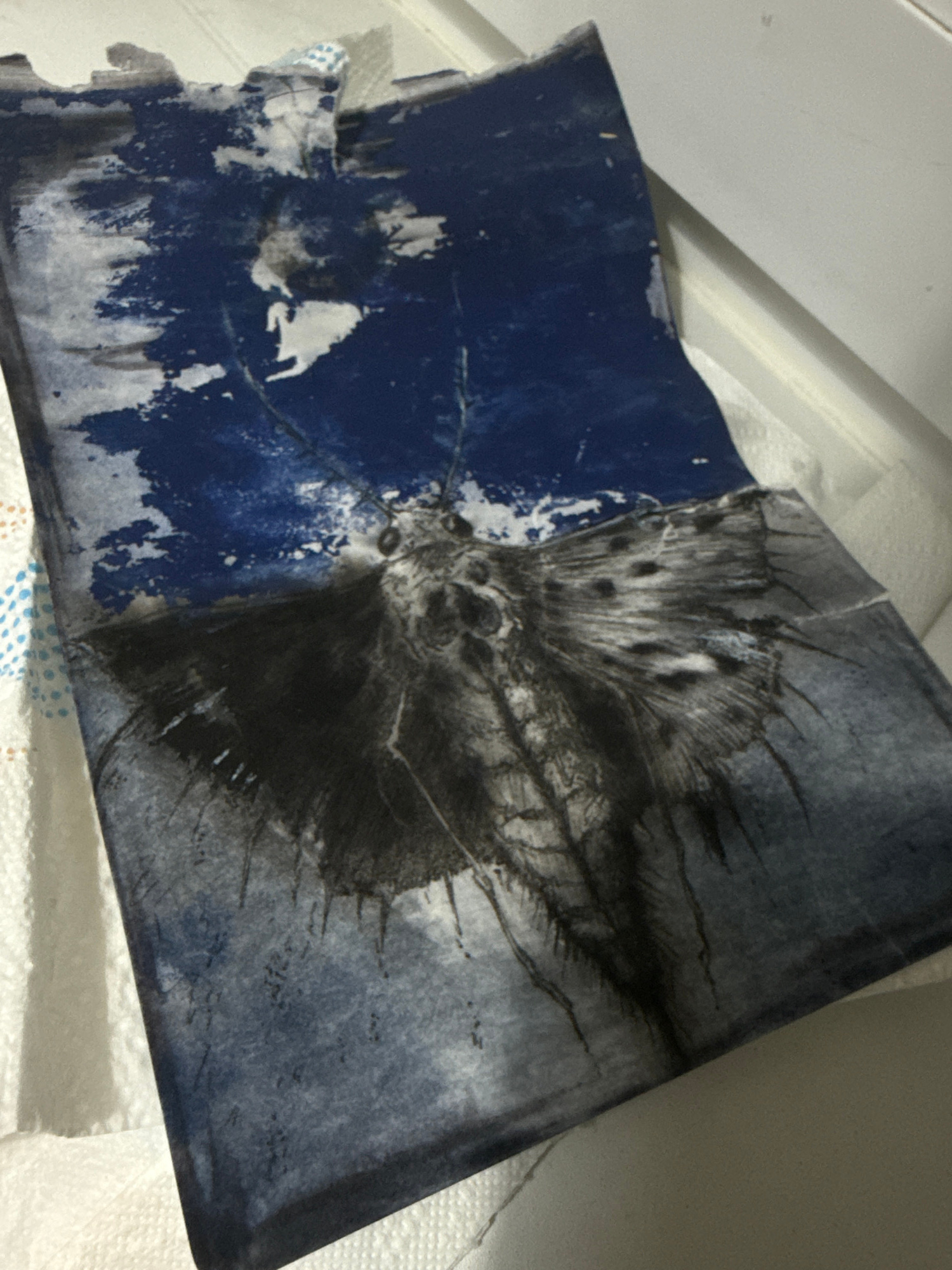 The image shows a piece of paper towel with a blue stain on the left and a dark, blurry image resembling a butterfly or moth in the center-right. The paper towel appears damaged or torn on the left ed…read more