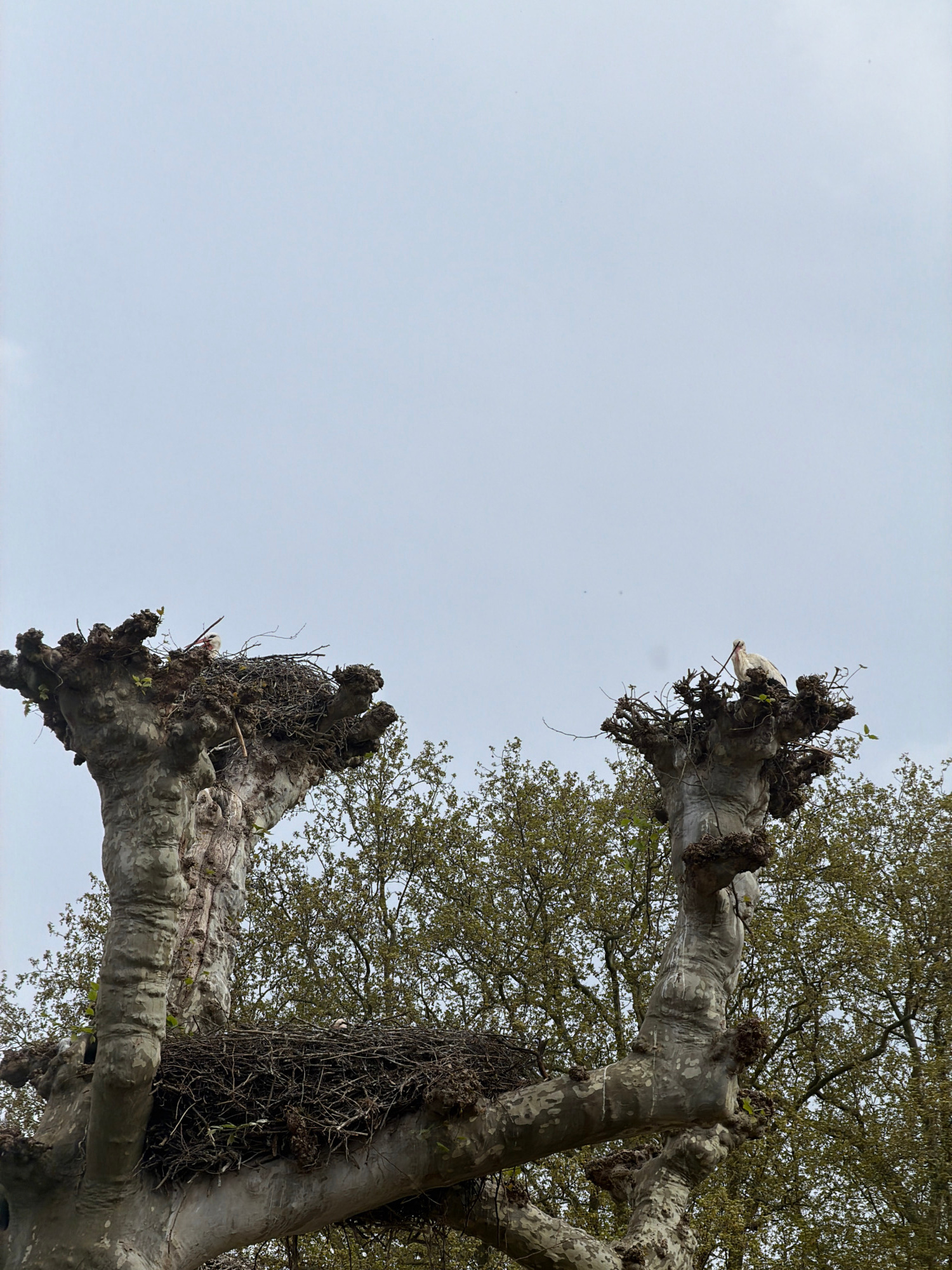 The image presents a low-angle view looking up into the dense, pollarded branches of a large tree, likely a plane tree (Platanus), set against an overcast, light grey sky. The tree's bark displays a cā¦read more